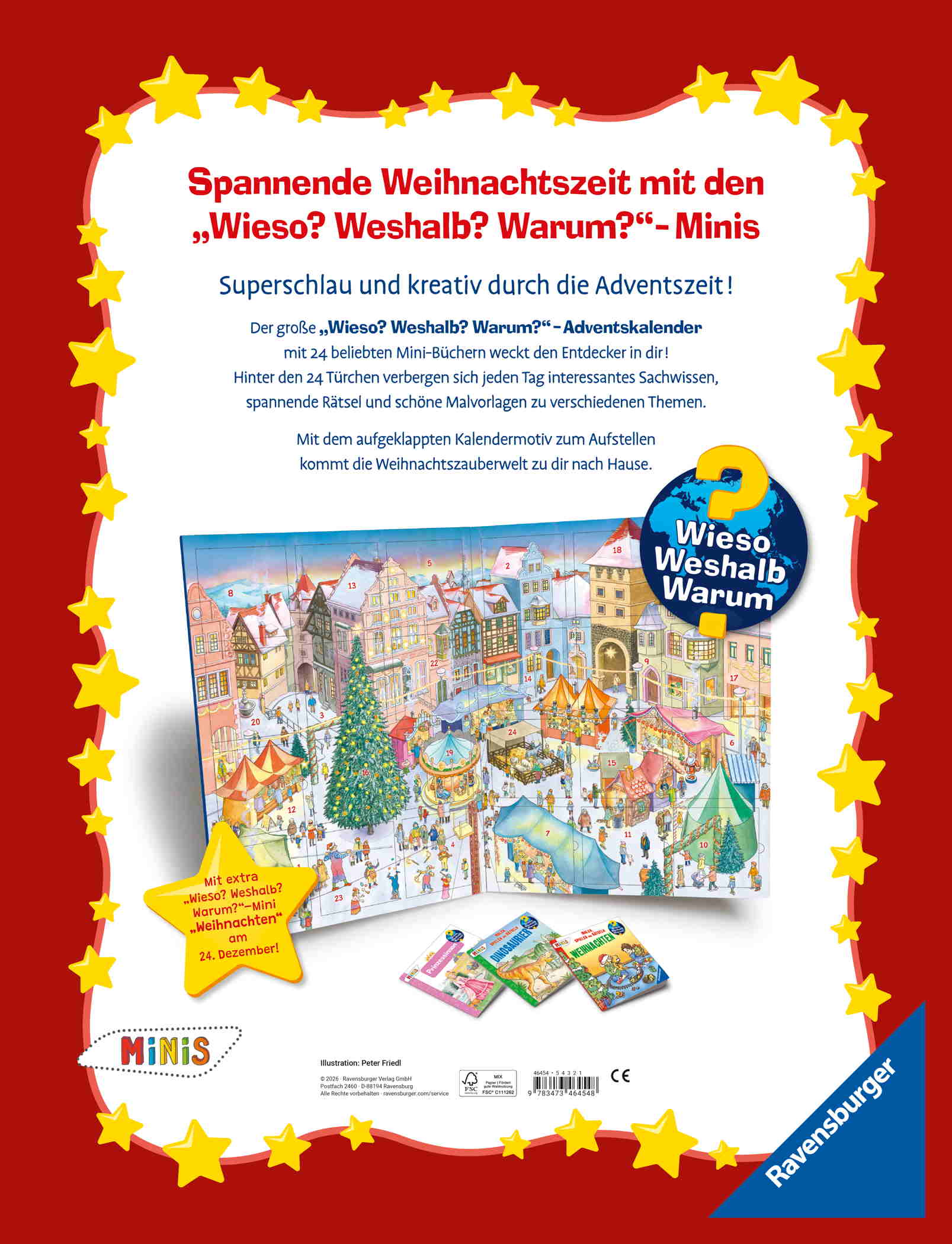 Der große „Wieso? Weshalb? Warum?"-Adventskalender mit den beliebten Mini-Büchern weckt den Entdecker im Kind. Hinter 24 Türchen stecken 24-mal spannendes Sachwissen, Rätsel und Malvorlagen zu verschiedenen Themen: von Baustelle über Dinosaurier und Prinzessinnen bis hin zu Weihnachten am 24. Dezember. So fiebern Mädchen und Jungen mit viel Neugierde und Entdeckerlust Weihnachten entgegen – und sie erhalten eine erste kleine Wissens-Bibliothek auch über die Weihnachtszeit hinaus!