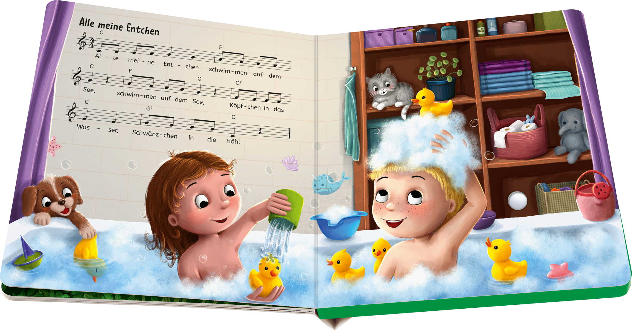 Ob allererste Klassiker wie „Alle meine Entchen" oder das beliebte Gute-Nacht-Lied „Schlaf, Kindlein, schlaf": Auf jeder Seite gibt es ein tolles Kinderlied zu hören.