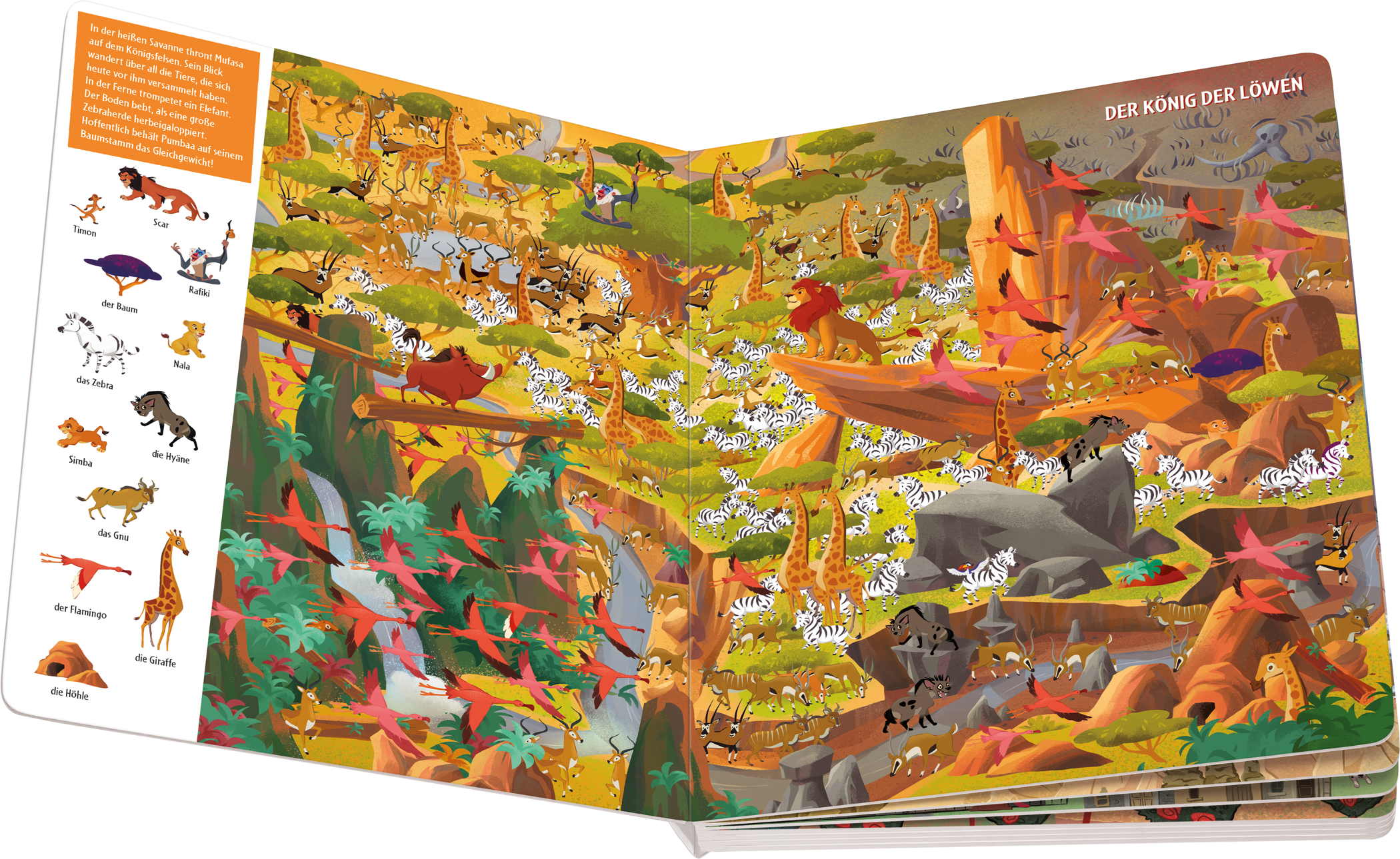 In diesem Pappbilderbuch nach dem beliebten Sachen-suchen-Prinzip entdecken Kinder ab 2 Jahren spielerisch und interaktiv die magische, bunte Welt von Disney. Auf 7 Doppelseiten animieren Wimmelbilder mit zahlreichen Details zum genauen Hinschauen. Das Suchen und Benennen der einzelnen Gegenstände, Tiere und Disney-Charaktere fördert spielerisch das Wahrnehmungsvermögen, die Konzentrationsfähigkeit und den Wortschatz der Kleinen. Kurze Einleitungstexte bieten hierfür einen leichten Einstieg. Neben den vorgegebenen Suchaufgaben bleibt natürlich auch genügend Spielraum für eigene Suchspiele. Das Kinderbuch beinhaltet die folgenden Disney- und Pixar-Themen: Der König der Löwen, Die Eiskönigin, 101 Dalmatiner, Alice im Wunderland, Toy Story, Arielle, die Meerjungfrau und Cars.