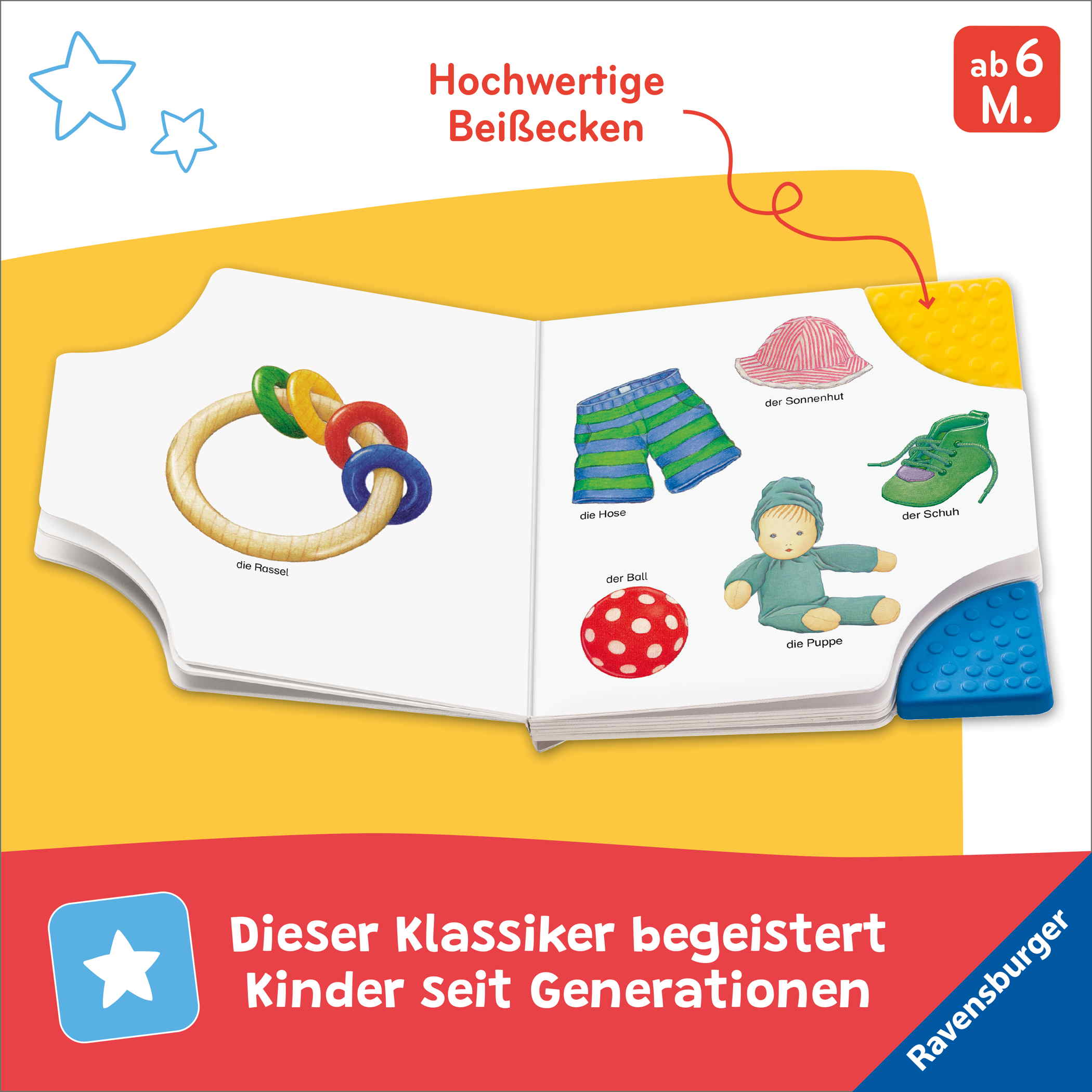 Wenn die ersten Zähnchen kommen, wird alles erstmal angeknabbert. Zwei bunte Beißecken laden dazu ein, dieses erste Babybuch mit allen Sinnen zu entdecken. Stabile Seiten zeigen die ersten Gegenstände aus dem Kinderalltag: den Teddy und die Puppe, den Ball und die ersten Schuhe. Ein allererstes Bilderbuch für zu Hause und unterwegs.