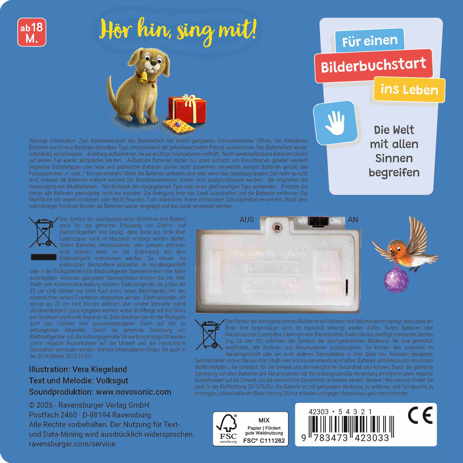 Durch sanften Druck auf die Soundknöpfe werden die Lieder kinderleicht aktiviert! Da schon Kleinkinder die Lieder selbst auslösen können, ist das Buch lange spannend und eignet sich gut zur Selbstbeschäftigung. Die Bücher werden mit 2 handelsüblichen AAA-Batterien (mit einer Spannung von 1,5 V) ausgeliefert. Der praktische An- und Ausschalter sorgt dafür, dass die Batterien geschont werden. Und wenn sie doch einmal leer sein sollten, sind die Batterien einfach auszutauschen.