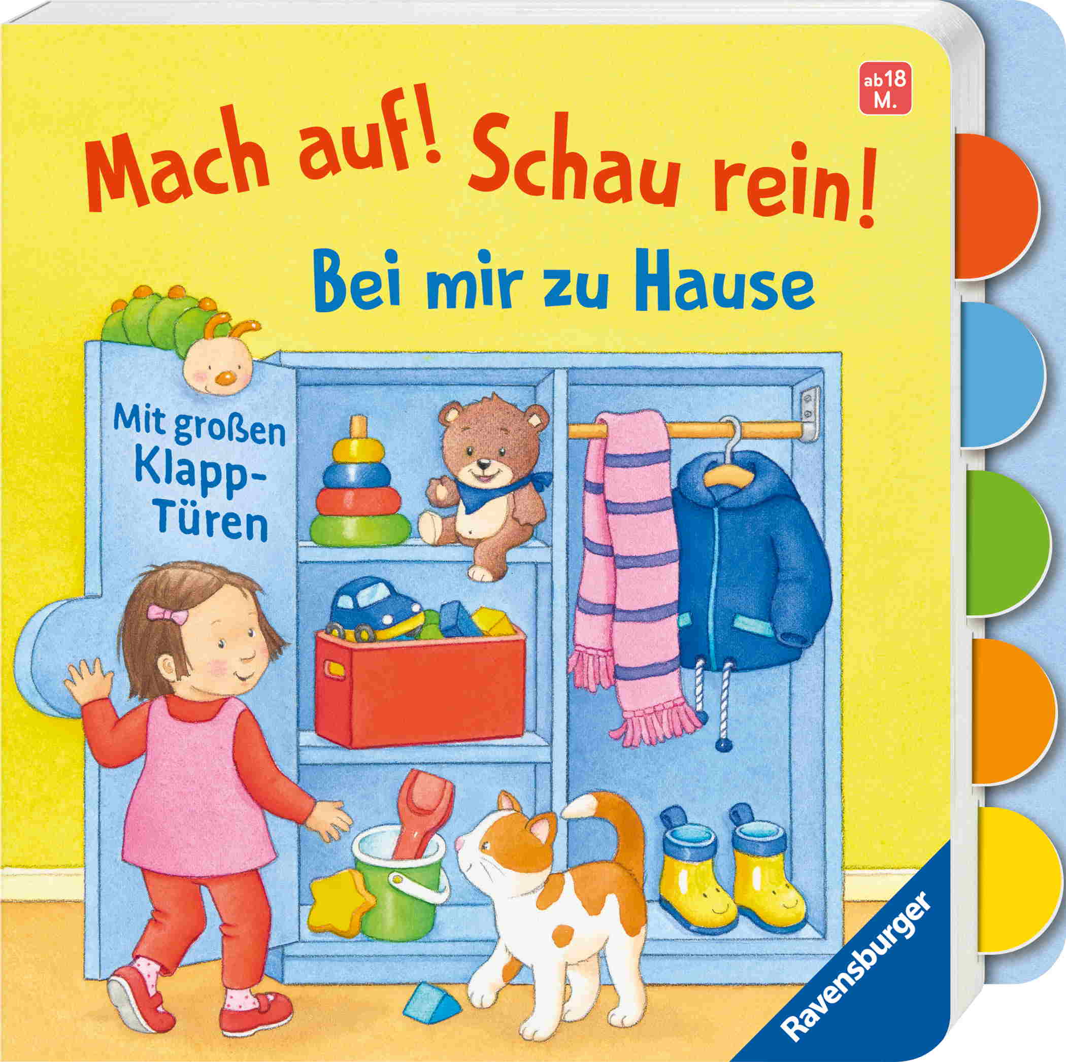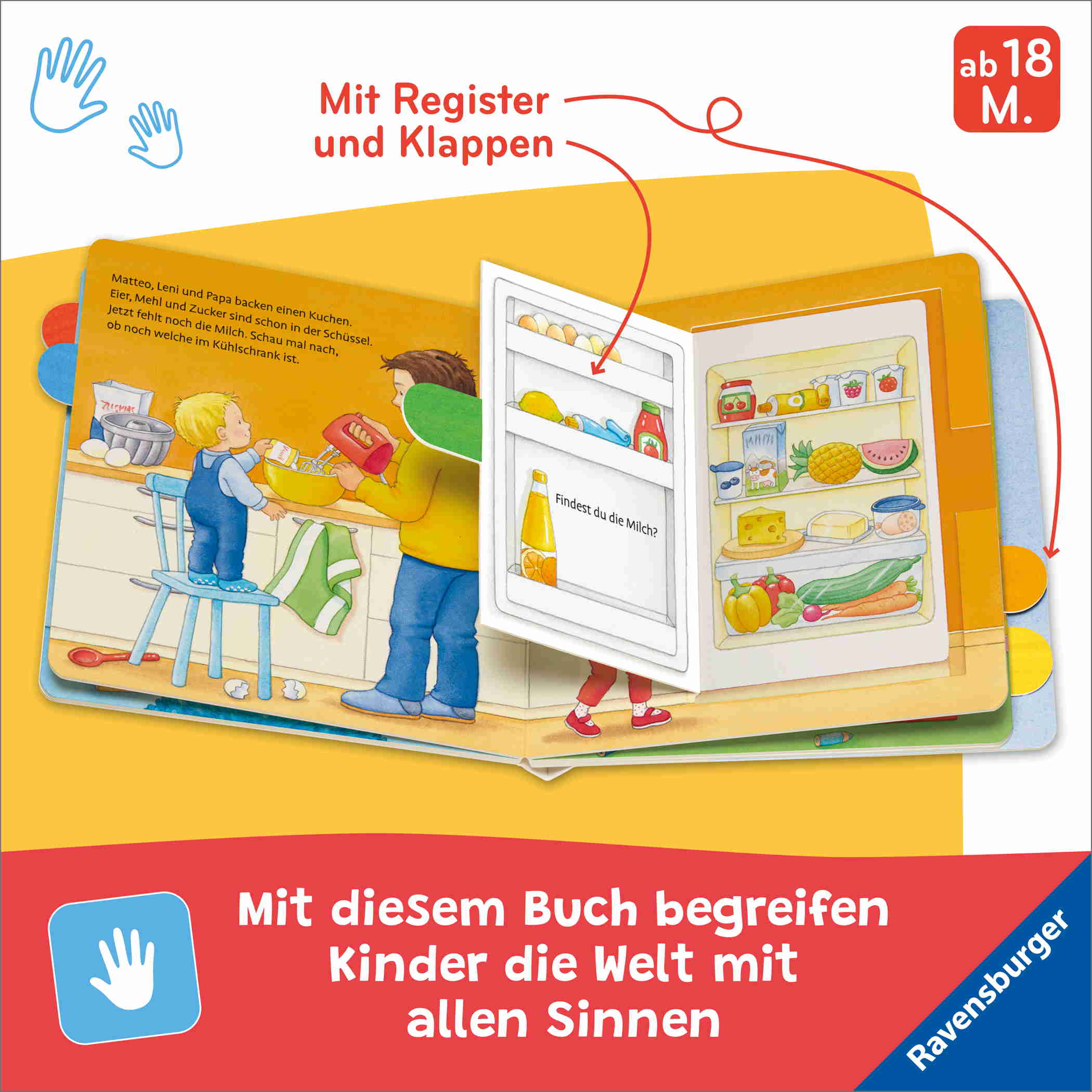 „Mach auf! Schau rein! Zu Hause“ ist ein besonderes Spiel- und Suchbuch. Denn im Inhalt gibt es extragroße und stabile Klappen, die auch schon die Kleinsten kinderleicht öffnen können. Die seitlichen Register helfen sowohl beim Finden der Lieblingsseite als auch beim Öffnen der Klappen, die Einblicke in verschiedene Schränke bieten: Im Badezimmerkästchen steht Matteos Zahnputzbecher, im Küchenschrank findet Leni die Teller. Und was gibt es im Kühlschrank?