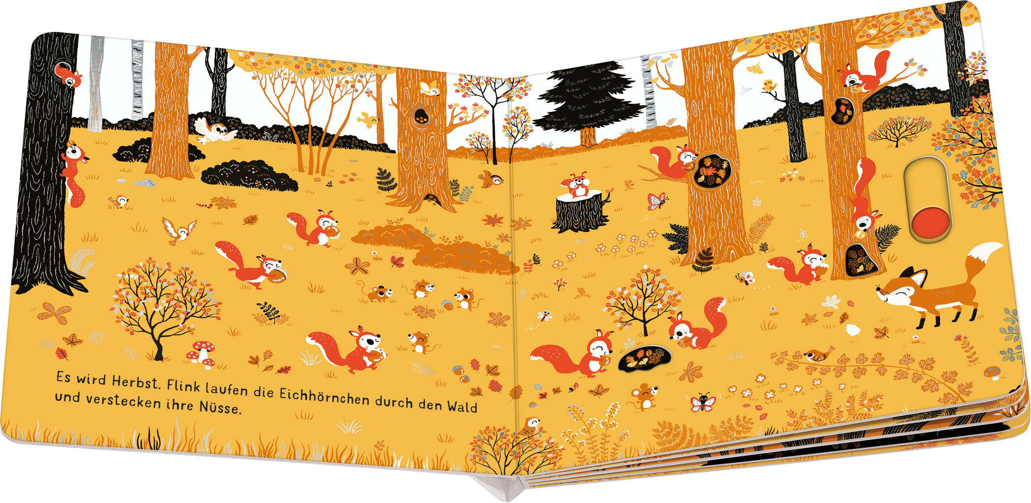 Es ist Herbst im Wald: Die Eichhörnchen sammeln Nüsse und verstecken sie an vielen Orten, der Hirsch ruft laut, um sein Kleines zu beschützen. Sein Ruf weckt die Wildschweine und Wiesel, die aufgeregt über die Wiese rennen. Der kleine Bär jagt den Schmetterlingen hinterher. Bevor der Winter kommt, haben die Waldtiere noch viel zu tun!