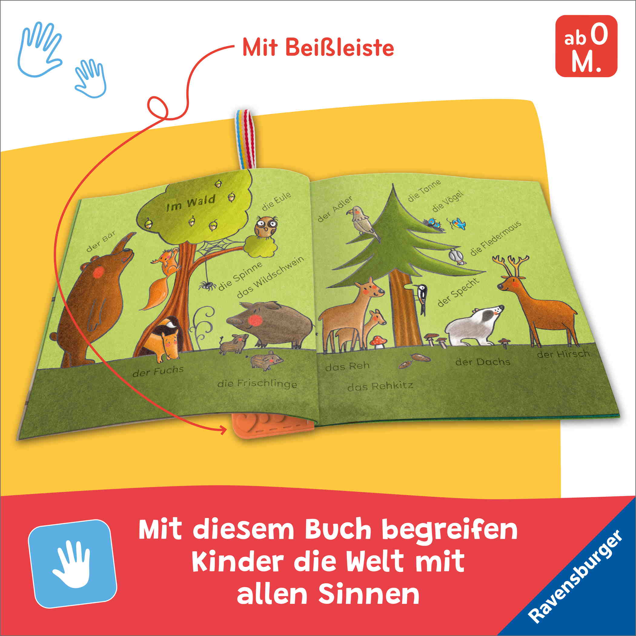 Dieses federleichte Stoffbuch für Kinder ab Geburt kommt mit ins Bett, in den Sandkasten, in die Badewanne und auch mal in die Waschmaschine. Unser buntes Knuddel-Knautsch-Buch lädt dazu ein, Bücher mit allen Sinnen zu entdecken – egal, ob mit Händen oder Zähnen. Die Beißleiste aus 100% Silikon sorgt für extra Knabberspaß.
