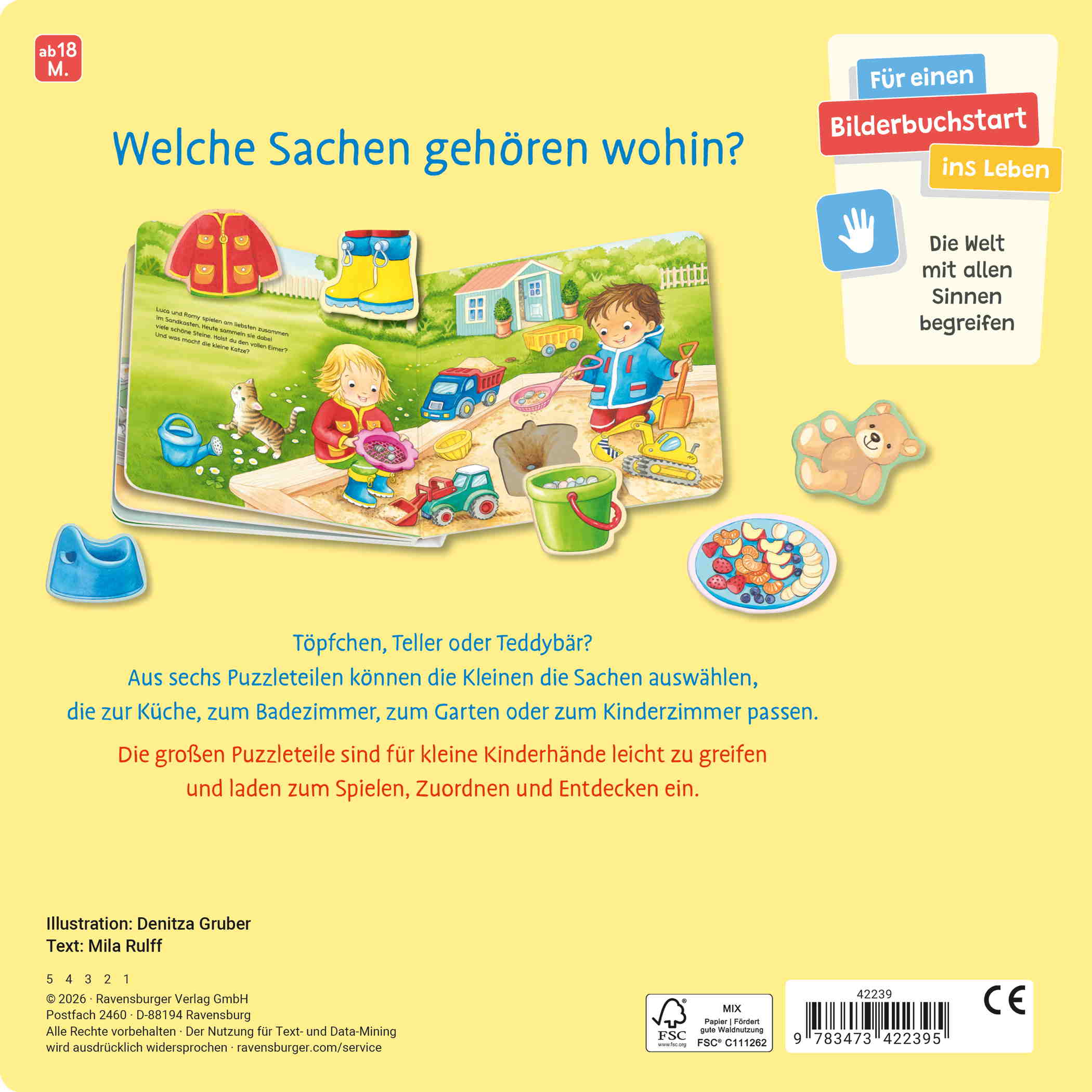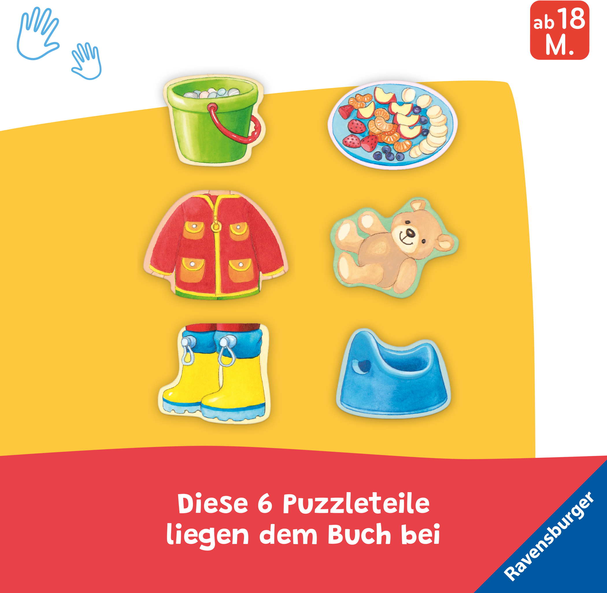 In diesem Spielbuch können Kinder ab 18 Monaten aus sechs Puzzleteilen den richtigen Gegenstand auswählen. Große Puzzlestücke ermöglichen ein leichtes Greifen und Vertiefungen helfen beim Einsetzen ins Buch. Dadurch wird die kindliche Feinmotorik und Wahrnehmung gefördert.