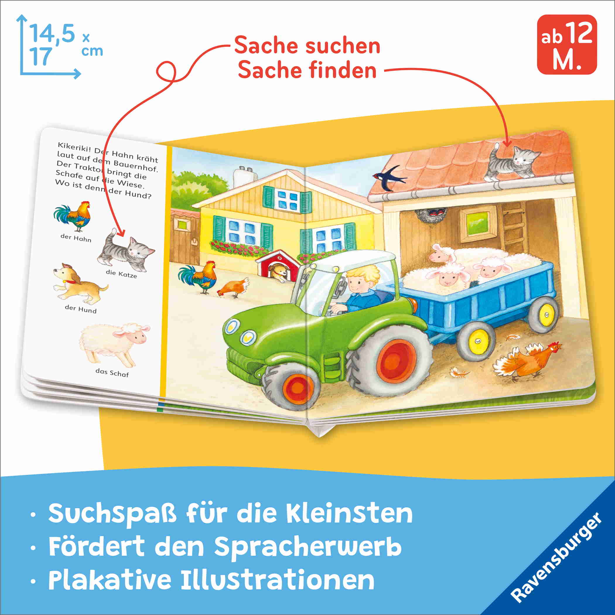 Kleine Kälbchen, niedliche Ferkel, große Traktoren und Maschinen: In diesem Buch entdecken die Kleinsten erste Motive rund um den Bauernhof. Auf jeder Seite laden spannende Suchbilder zum Benennen, Suchen und Wiederfinden ein. Was fressen die Kühe? Wo versteckt sich die Maus? Und was gibt es im Hofladen zu kaufen?