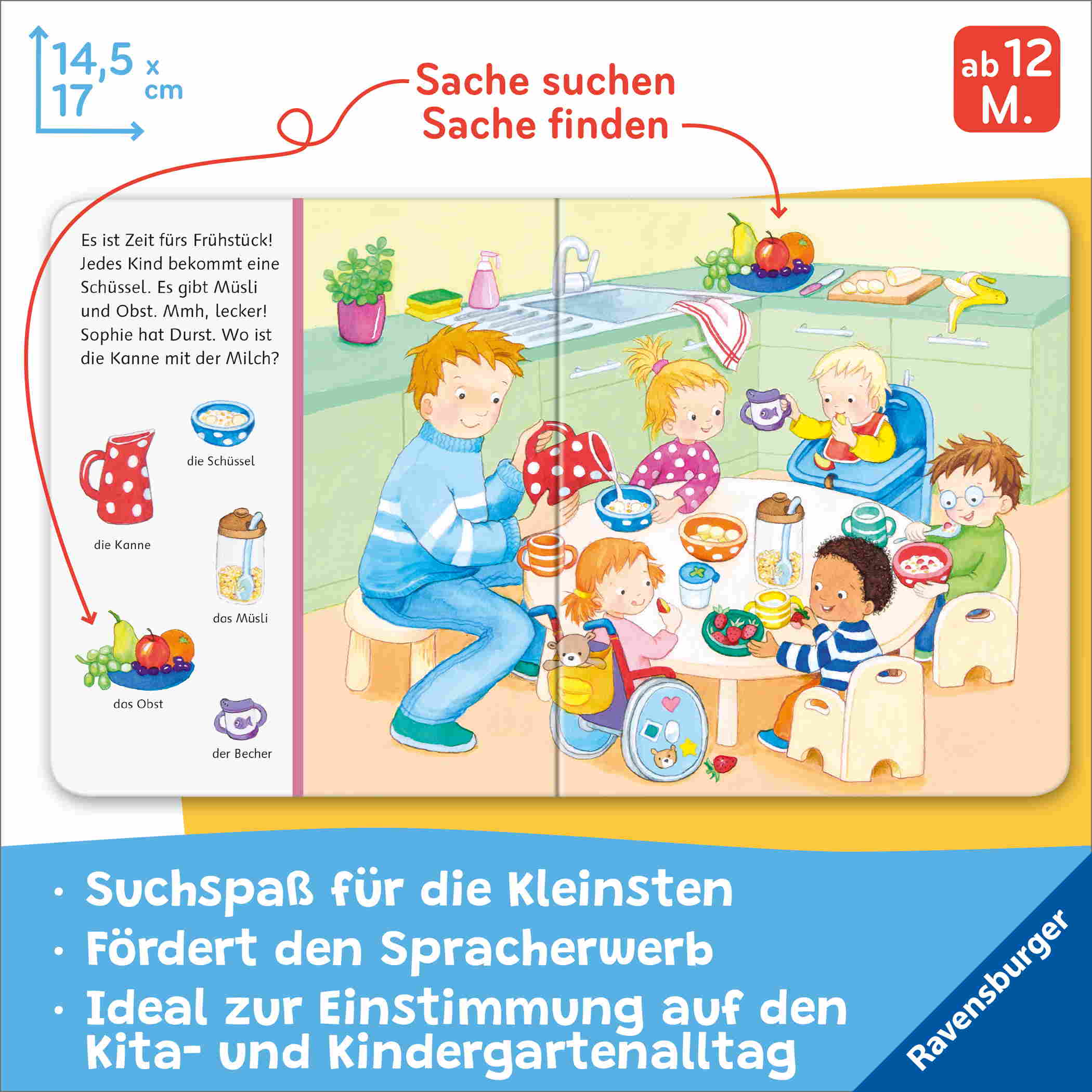 Die Menge an Suchbildern ist für Kleinkinder gut erfassbar, sodass sie nicht überfordert werden und ganz spielerisch neue Wörter lernen können. Das perfekte erste Bilderbuch für einen guten Start in den neuen Kindergartenalltag!