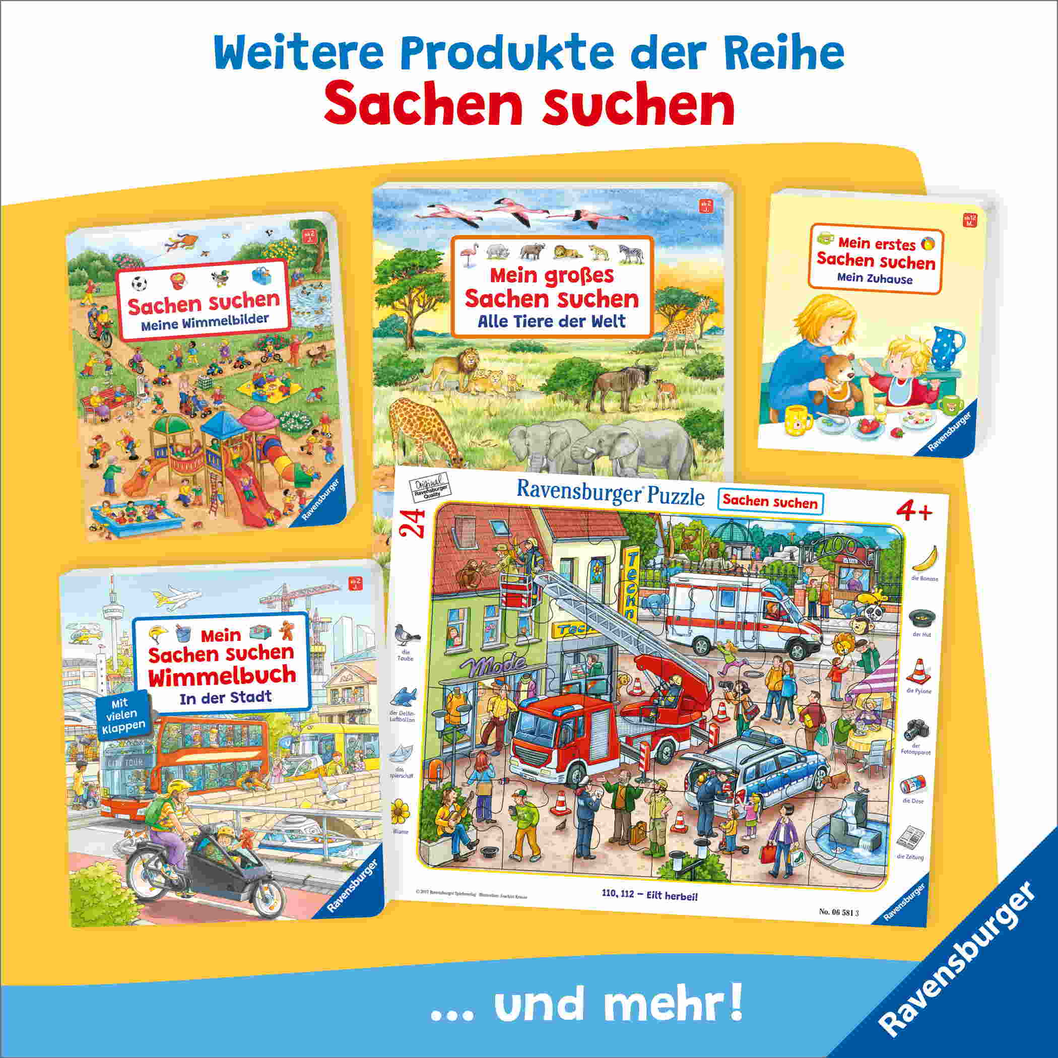 Die Pappbilderbücher aus der Kleinkindreihe „Mein erstes Sachen suchen“ im handlichen Format sind der ideale Einstieg in die beliebte „Sachen suchen“-Welt. Auf jeder Doppelseite können die Kleinen ab 12 Monaten Suchbilder benennen und in bekannten Situationen im Bild wiedererkennen. So wird der Spracherwerb optimal unterstützt.