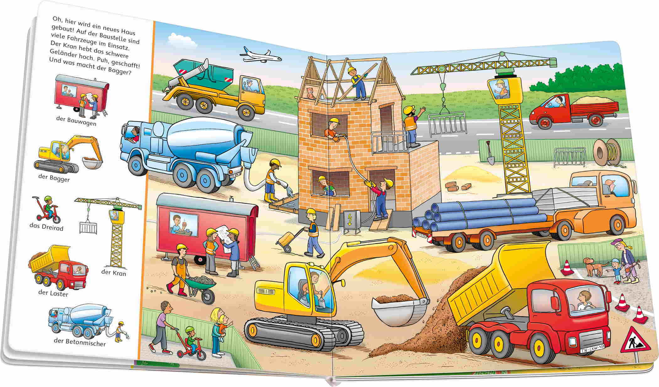 In diesem Buch dreht sich alles um das Lieblingsthema Fahrzeuge und um Szenen, die bereits Kleinkinder aus ihrem nahen Umfeld kennen. Die Müllabfuhr holt die vollen Tonnen ab, Bagger und Betonmischer arbeiten auf der Baustelle, am Obststand werden Erdbeeren verkauft und in der Stadt sind Bus und Bahn unterwegs.
