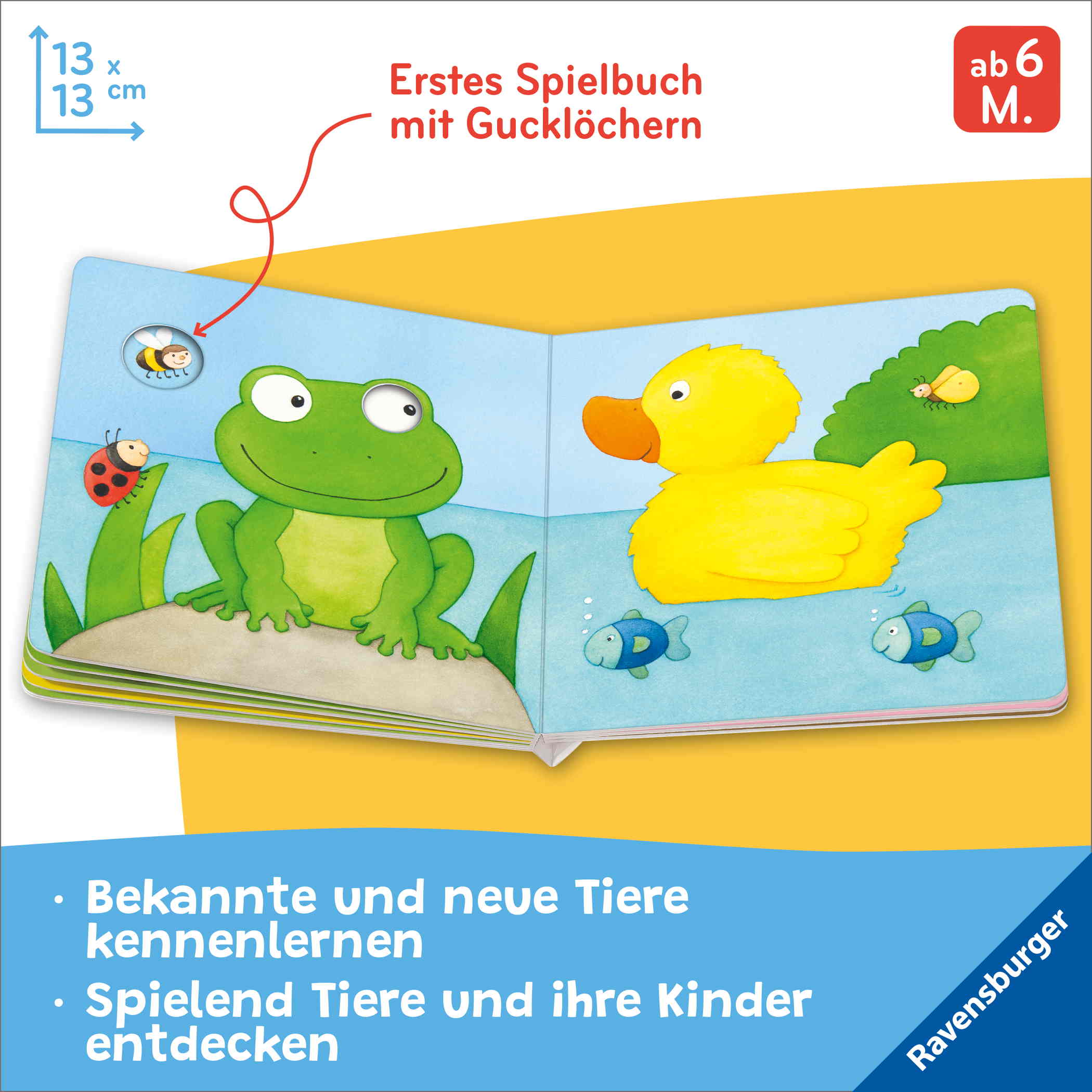 Schon die Kleinsten sind begeistert, wenn sie Tiere sehen, deren Namen sie schon kennen und im Bilderbuch wiederfinden! Da ist die kleine Katze, das Huhn mit seinen Küken, der lustige Affe und der große Elefant. In diesem handlichen Bilderbuch können Kleinkinder viele bekannte Tiere und ihre Kinder spielerisch entdecken oder kennenlernen. Zahlreiche Gucklöcher laden kleine Kinderhände zum Hineingreifen und Umblättern ein. Das macht Spaß, fördert die Feinmotorik und das Sprechenlernen.