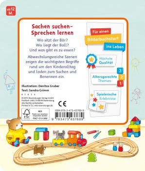 Wo sitzt der Bär? Wo liegt der Ball? Und was gibt es zu essen? Abwechslungsreiche Szenen zeigen die wichtigsten Begriffe rund um den Kinderalltag und laden zum Suchen und Benennen ein.