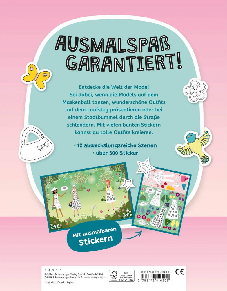 Mode-Fans finden in diesem Heft 12 abwechslungsreiche Szenen zum individuellen Gestalten. Mit über 300 Stickern können Kinder die Anziehpuppen mit wunderschönen Ballroben, coolen Party-Outfits, zauberhaften Sommerkleidern und vielen weiteren Accessoires schmücken. DAS BESONDERE: Nicht nur die Szenen können ausgemalt werden, viele der Sticker selbst sind AUSMALBAR!