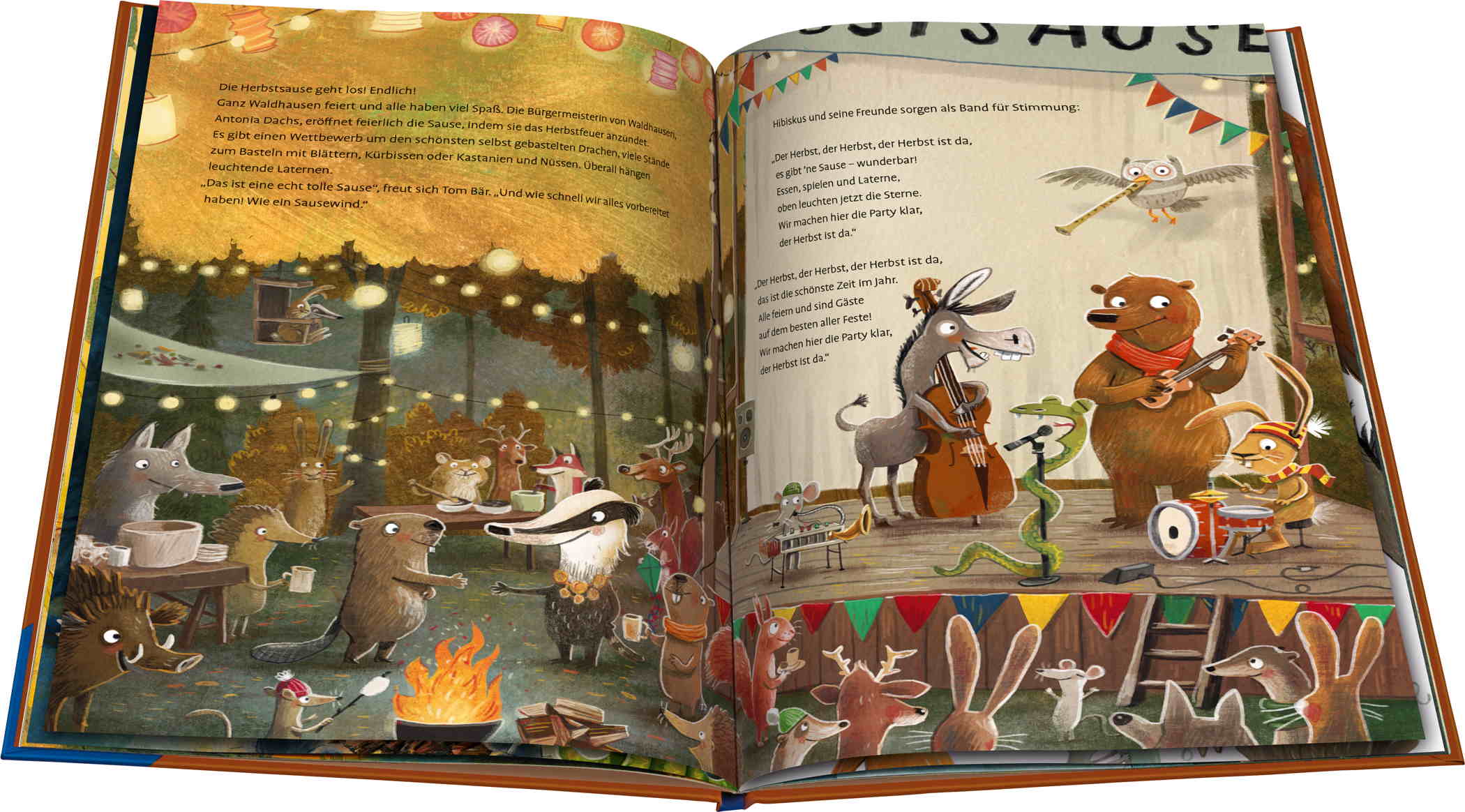 Hase Hibiskus und seine Freunde freuen sich auf die große Herbstsause. Denn da gibt es einen Laternenumzug, ein Lagerfeuer und das beste Essen! Doch bis zum Fest gibt es noch jede Menge zu tun – und viele kleine Abenteuer zu bestehen. Ob verlorene Mausharmonika, ein umgestürzter Baum oder ein Freund in Not: Gemeinsam meistern sie jedes Hindernis mit Herz, Humor und Musik. Ein fröhliches Bilderbuchabenteuer voller Freundschaft, Spaß und Herbstzauber!