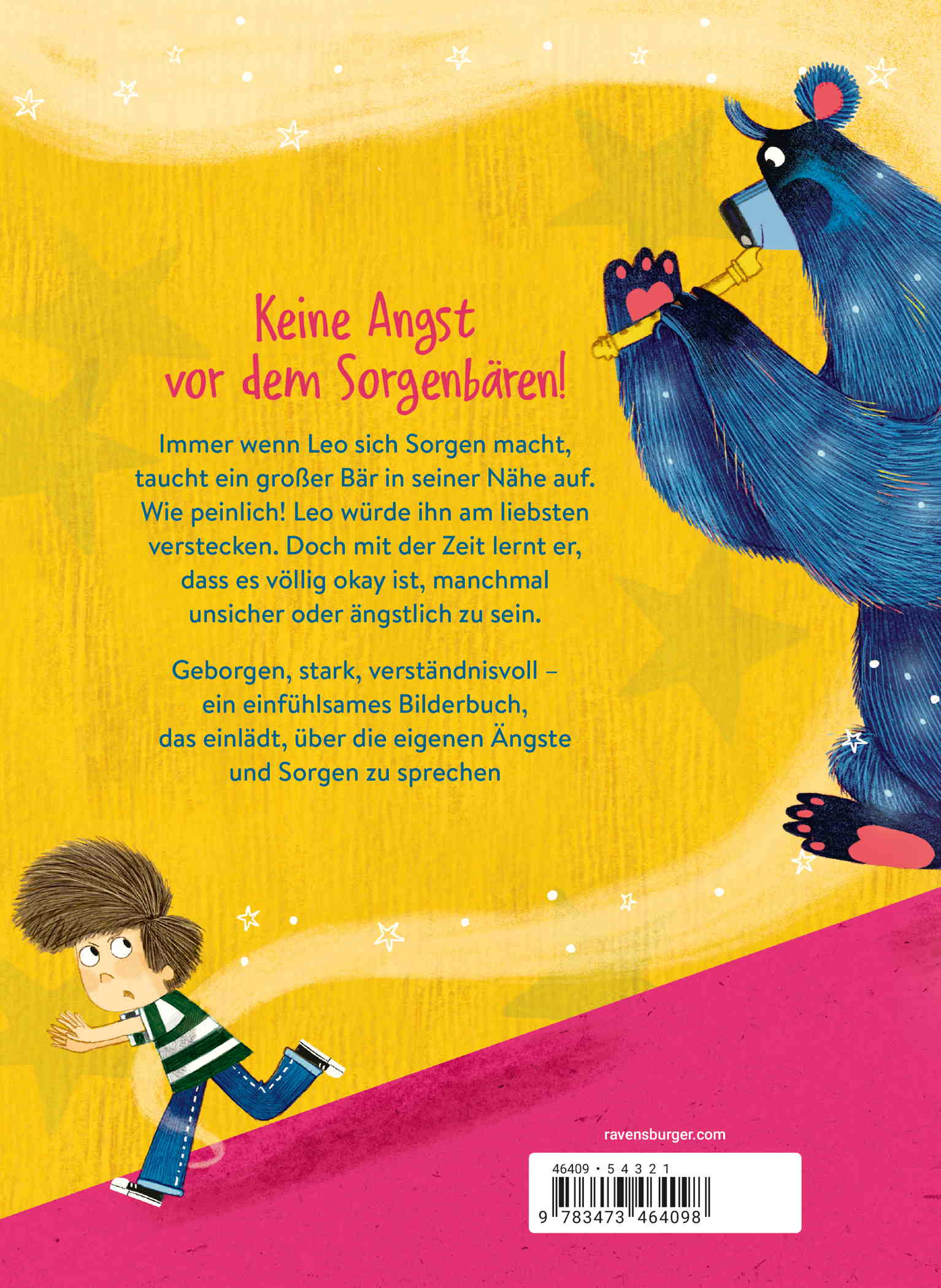 Leo ist ein bisschen schüchtern, vor allem vor seinem ersten Tag im neuen Kindergarten. Er macht sich viele Gedanken und immer, wenn er sich sorgt, taucht ein großer Bär in seiner Nähe auf. Leo würde ihn am liebsten verstecken, aber der Sorgenbär ist immer da. Nur wenn Papa ihn umarmt oder wenn er mit seinen Freunden spielt, dann verschwindet der Bär von ganz allein – bis er ganz unerwartet wieder auftaucht. Doch mit der Zeit versteht Leo: Jeder hat mal Angst. Und das ist völlig okay.