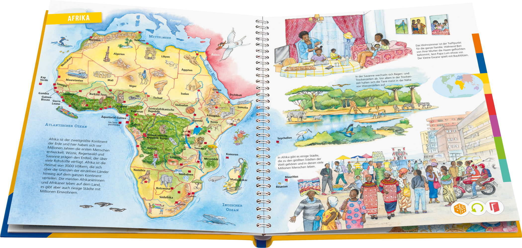 In Neuseeland spielen viele Menschen gerne Rugby. Trotz der eisigen Kälte gibt es in der Antarktis Vulkane. In der afrikanischen Millionenstadt Kinshasa regeln Roboter den Verkehr. Unsere Welt steckt voller Überraschungen! Mit diesem Atlas lernen Kinder ab 5 Jahren die Welt kennen. Unsere Kontinente und Länder sowie die Menschen, die in ihnen leben. Kultur und Bräuche, Bauwerke und Naturphänomene, Tiere und Pflanzen. Mit zahlreichen Geräuschen, kindgerechten Wissenstexten und Spielen.
