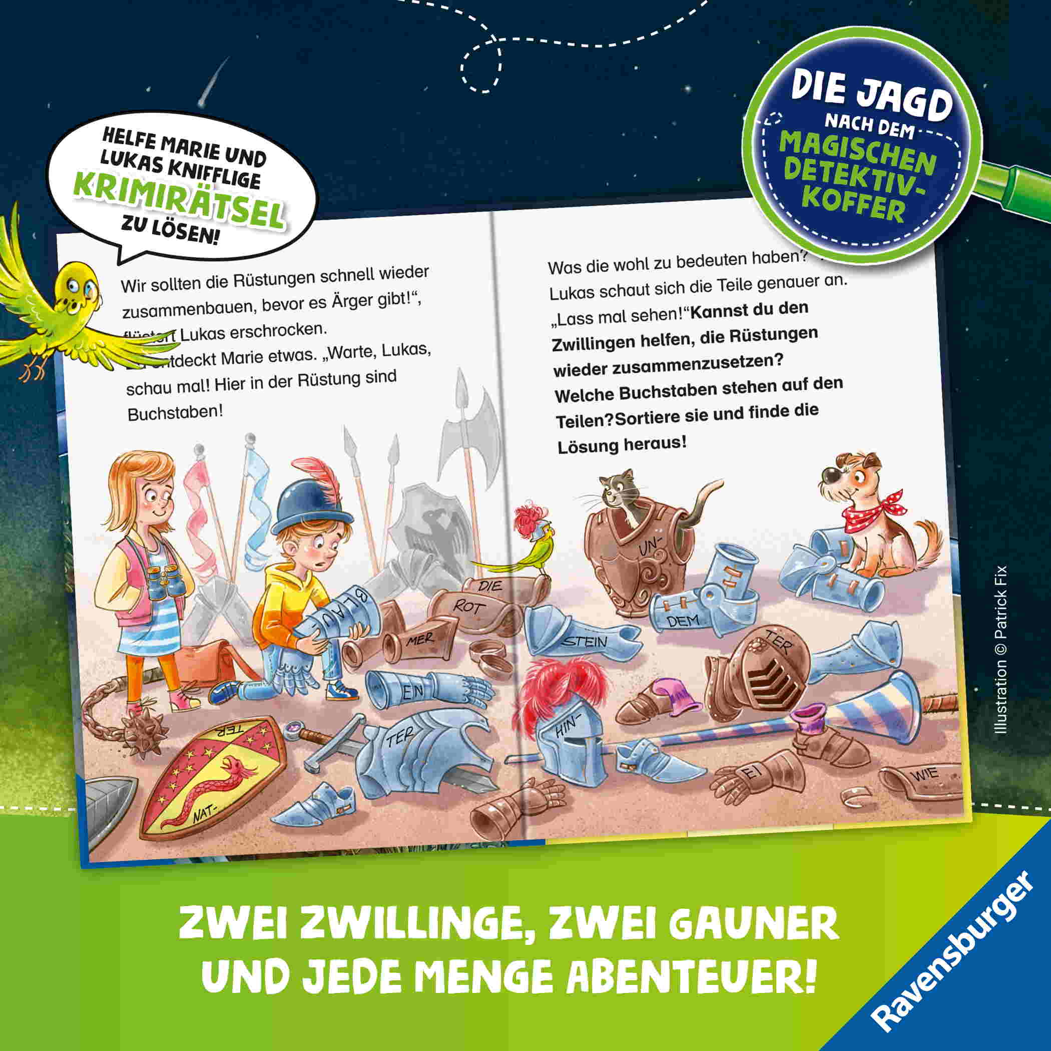- Bei einer Führung auf Burg Rätselstein erfahren die Zwillinge Lukas und Marie von einem geheimnisvollen Schatz. Und mit Hilfe der magischen Gegenstände aus ihrem Detektivkoffer entdecken sie schon bald erste Hinweise darauf, wo der Schatz von Ferdinand, dem Vergesslichen, versteckt sein könnte. Doch Vorsicht! Auch die beiden tollpatschigen Ganoven Topf und Deckel wittern ihre Chance und sind den Zwillingen dicht auf den Fersen ... Das vierte Abenteuer der Erfolgsreihe!