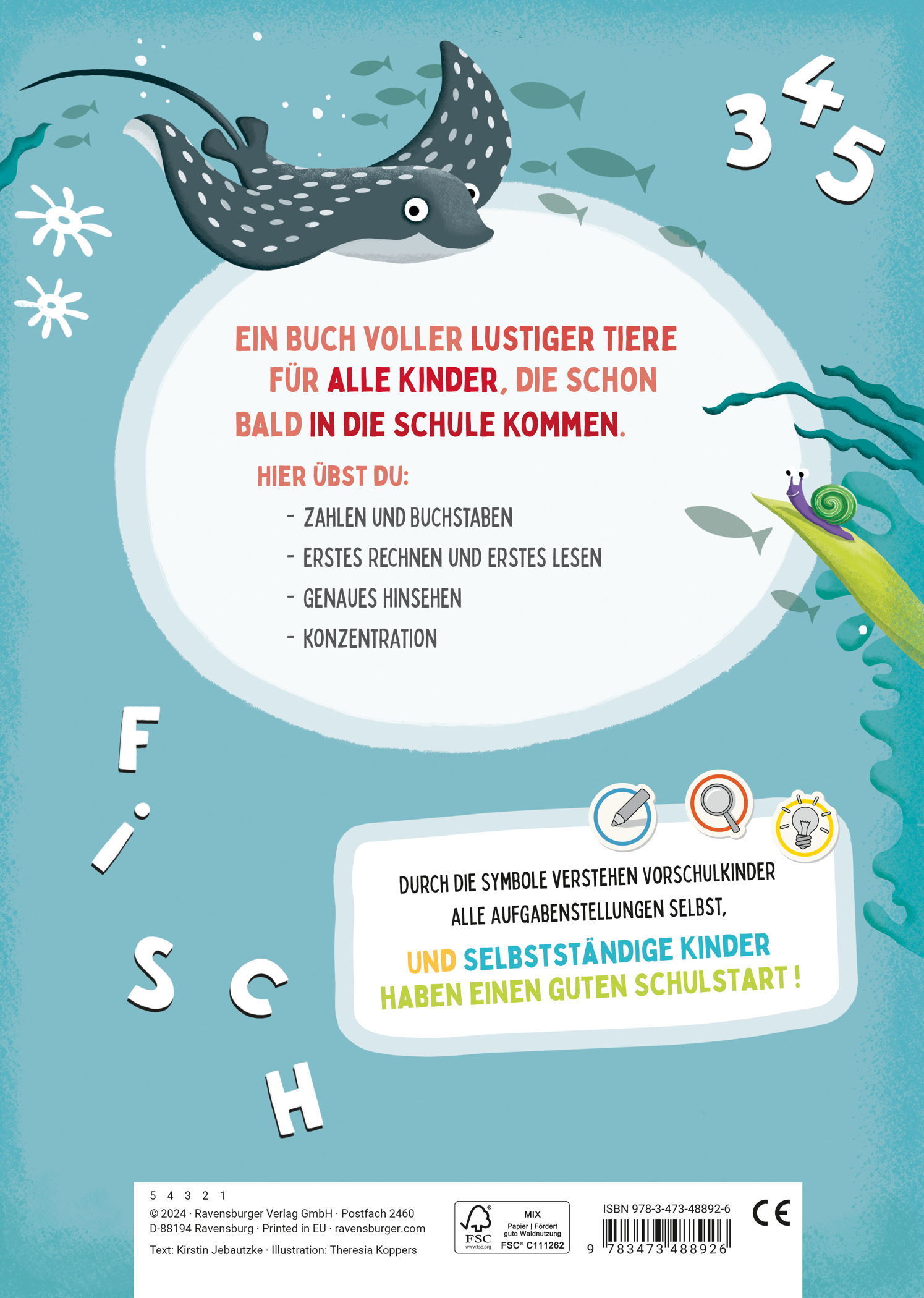 So steht dem Schulstart nichts mehr im Wege: Mit diesem Schulstartbuch lernen Kinder spielerisch die Grundlagen für die Grundschule. Alle wichtigen Themen sind in diesem dicken Buch zusammengefasst und thematisch sortiert: Buchstaben & Wörter, Konzentration, Zählen & Zahlen und Logik.