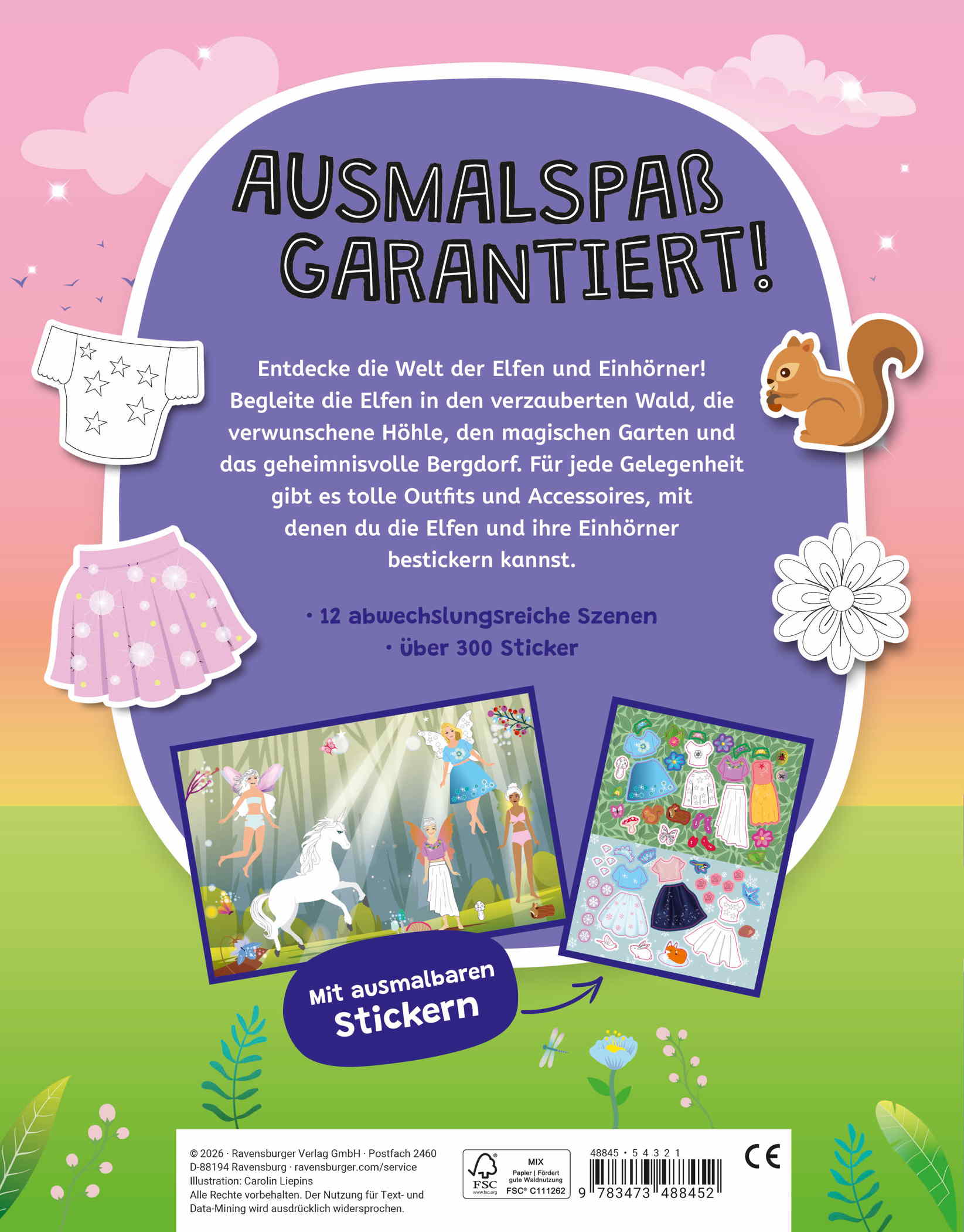 Elfen und Einhörner in verwunschenen Szenerien vom Zauberwald bis zur magischen Eislandschaft. In diesem Heft finden Elfenfans 12 atemberaubende Szenen zum individuellen Gestalten. Mit über 300 Stickern können Kinder ab 4 Jahren nach Herzenslust Elfen mit magischen Kleidern und Accessoires ausstatten, Einhörner dekorieren und Details in magischen Welten ergänzen. DAS BESONDERE: Nicht nur die Szenen können ausgemalt werden, viele der Sticker selbst sind AUSMALBAR!