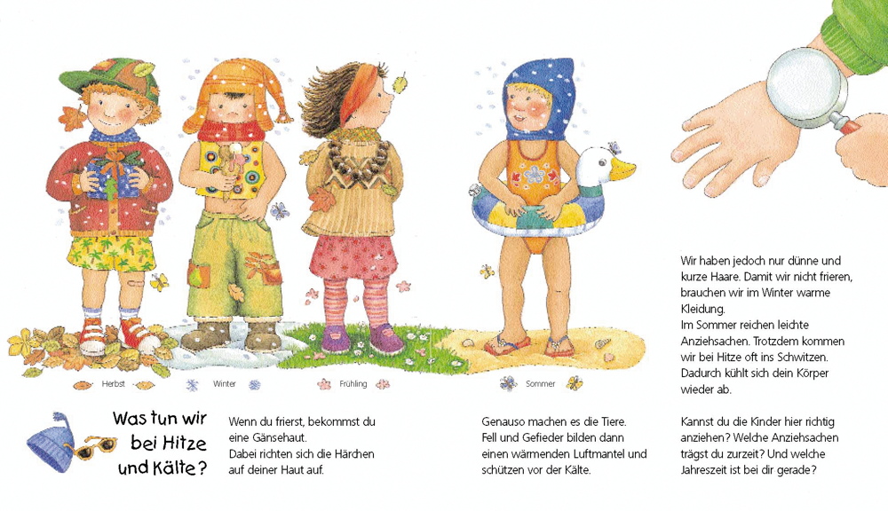Ob Frühling, Sommer, Herbst oder Winter – jede Jahreszeit hat ihren Zauber. Doch warum wechseln die Jahreszeiten? Welche Beeren pflücken wir im Sommer? Was machen Tiere im Winter? Antworten und verblüffende Klappen finden Kinder in diesem Buch. So erfahren sie, wie sich ein Apfelbaum im Jahreslauf verändert oder wie wir uns passend zur Jahreszeit anziehen. Eine bunte Drehscheibe verrät, welche Monate zu welcher Jahreszeit gehören.