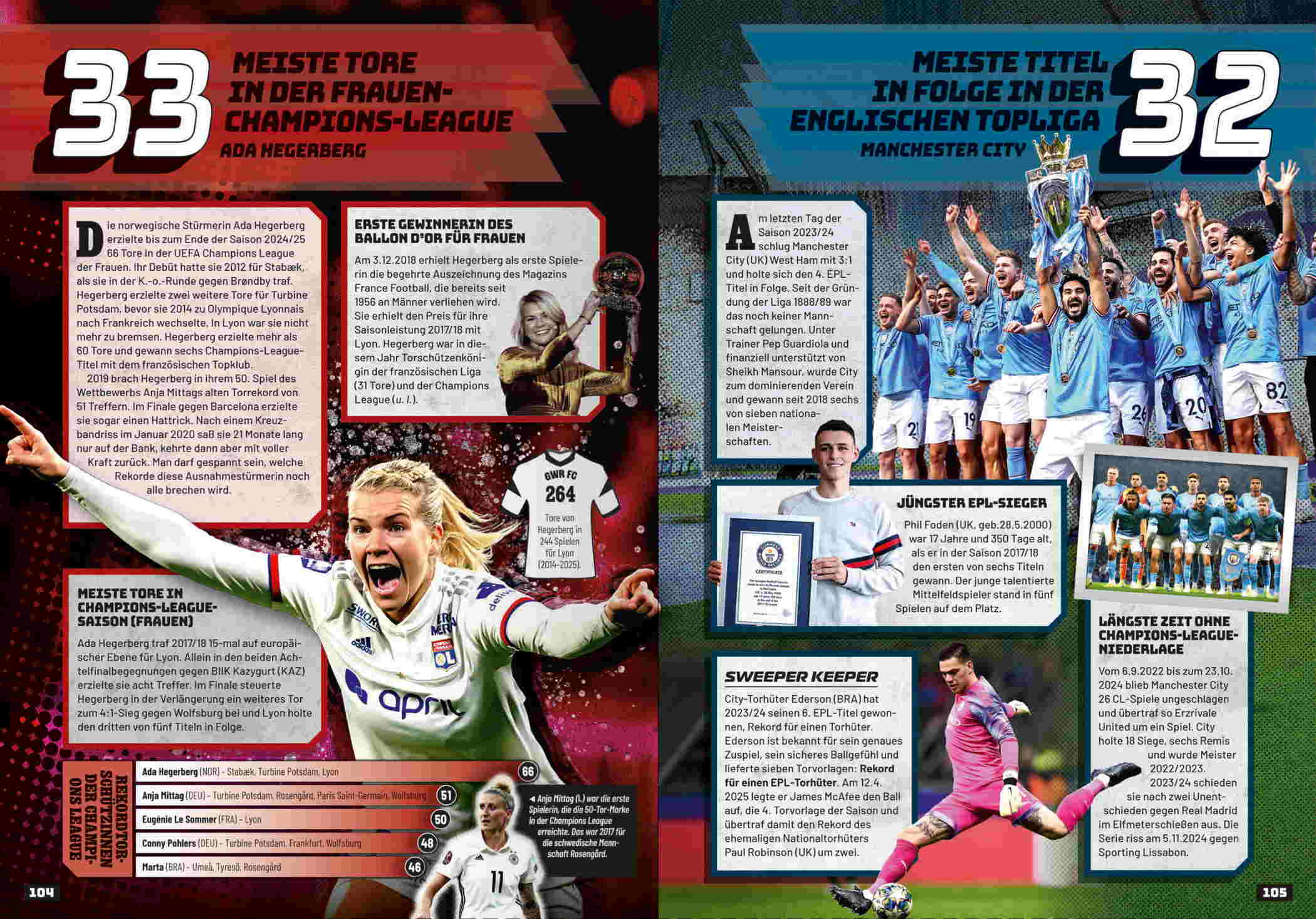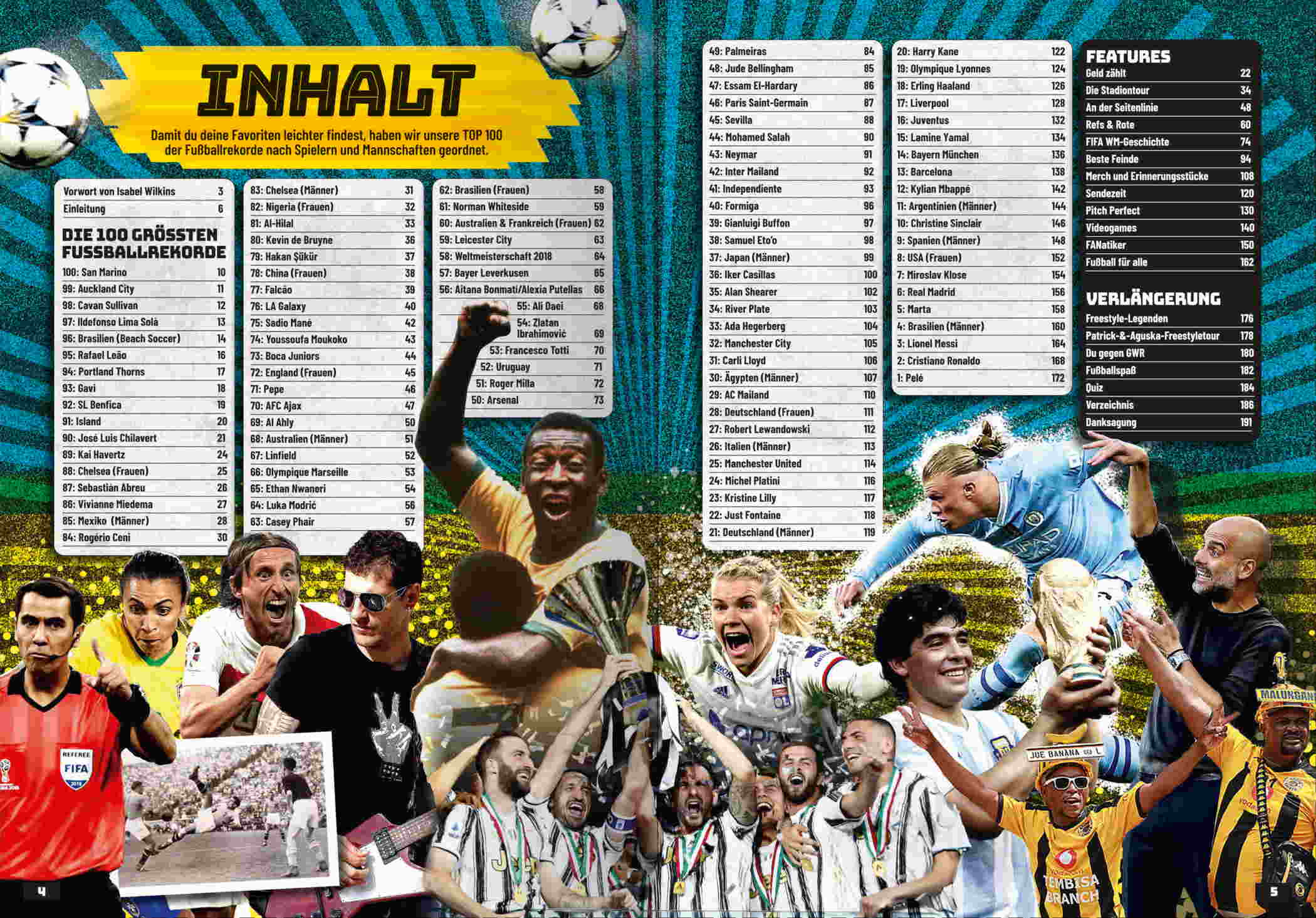 Mit rund 3,5 Milliarden Fans weltweit ist Fußball der beliebteste Sport der Erde. Guinness World Records hat die Top 100 der größten Fußball-Weltrekorde aller Zeiten ausgewählt, z. B. die besten Spielerinnen und Spieler, die je auf dem Rasen standen: historische Ikonen wie Pelé und Maradona, moderne Legenden wie Marta, Messi, Ronaldo und Neymar und die aufstrebenden Stars von morgen wie Lamine Yamal und Linda Caicedo. Dazu die wichtigsten Klubs, Champions-League-Partien, Derbys und vieles mehr.