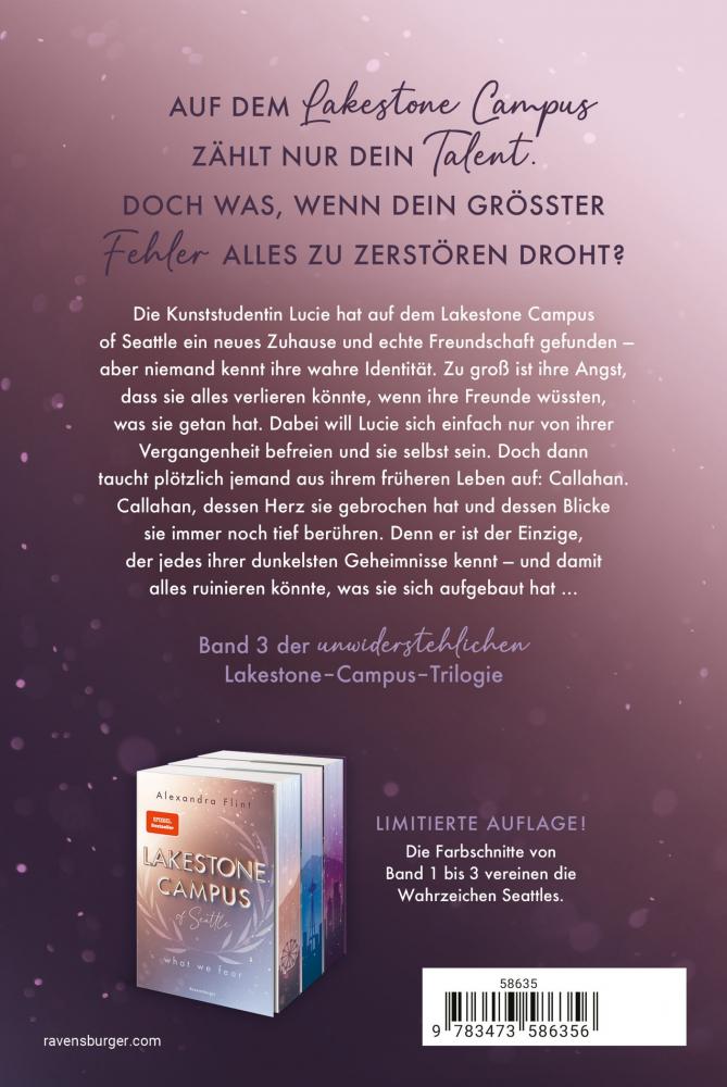 Die Kunststudentin Lucie hat auf dem Lakestone Campus ein Zuhause und echte Freundschaft gefunden – aber niemand kennt ihre wahre Identität. Zu groß ist ihre Angst, alles zu verlieren, wenn ihre Freunde wüssten, was sie getan hat. Dabei will Lucie einfach nur sie selbst sein. Doch dann taucht plötzlich jemand aus ihrem früheren Leben auf: Callahan. Callahan, dessen Herz sie gebrochen hat und dessen Blicke sie tief berühren. Denn er ist der Einzige, der jedes ihrer dunkelsten Geheimnisse kennt …