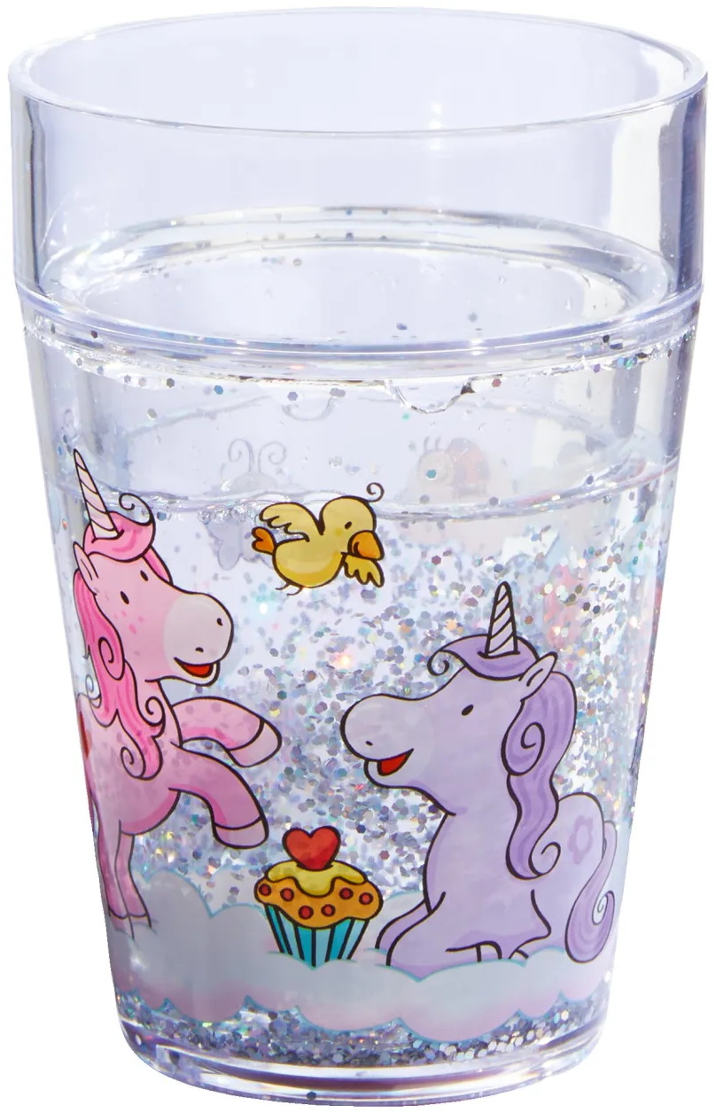 Begeistert beobachten die Einhörner Glitzerglück und Wunderblume, wie winzige Glitzerteilchen in der Wand des tollen HABA-Glitzerbechers Einhorn Glitzerglück hin und her schweben. Bei jeder Bewegung glimmert und funkelt es. Egal, ob Wasser, Apfelsaftschorle oder Tee – da schmeckt alles nochmal so gut. Mit einem Boden-Durchmesser von 7,5 cm lässt sich der fabelhafte Trinkbecher gut von Kinderhänden umfassen. Der HABA-Glitzerbecher Einhorn Glitzerglück ist aus stabilem Kunsstoff und lässt sich schnell und einfach reinigen. So ist er schnell wieder einsatzbereit – das freut nicht nur Glitzerglück und Wunderblume!