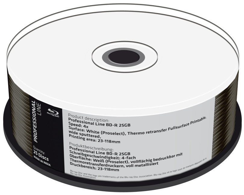 MediaRange Professional Line Medien sind auf die hohen Ansprüche professioneller Duplikation abgestimmt. Professional Line steht für ein Höchstmaß an Zuverlässigkeit zu einem attraktiven Preis. Die Inkjet-Fullsurface-Oberfläche hat einen Druckbereich von 23mm bis 118mm. Die Unterseite der Disc ist über den kompletten Druckbereich metallisiert, um auch im Innenbereich ein durchgängiges Druckbild zu erhalten. Die Inkjet-Oberfläche überlappt innen sowie außen um 0,5mm die weiße Grundschicht um weisse Ränder durch nicht zentriertes Drucken zu vermeiden.