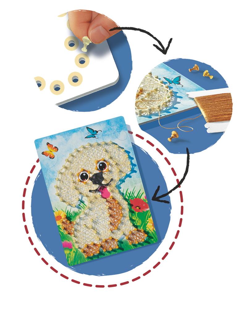 Mit dem Ravensburger String Art-Set Dogs erlernen bereits Kinder ab 6 Jahren die beliebte Technik String Art. Hier werden keine Nägel eingeschlagen, sondern Kunststoffpins eingedrückt. Sind alle Pins gesteckt, werden auf der Vorderseite der Tafel die bunten Fäden ganz nach Belieben kreuz und quer gespannt, bis das Fadengeflecht das Motiv erscheinen lässt. Wann das Fadenbild fertig ist, entscheidet jeder selbst.