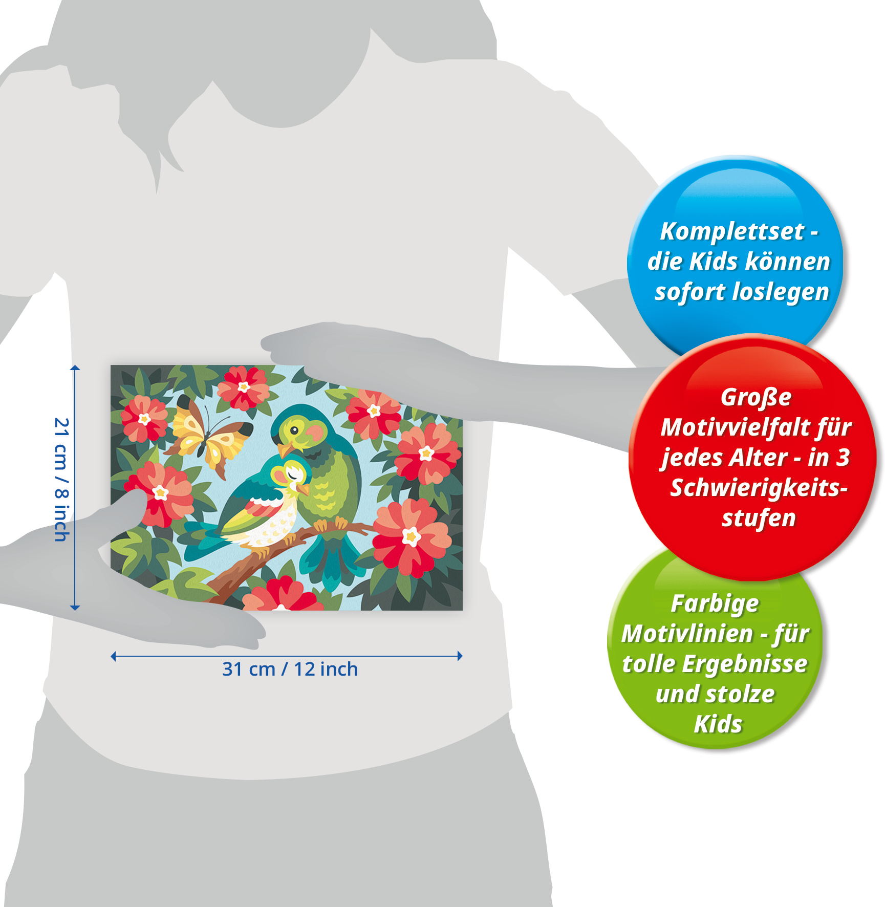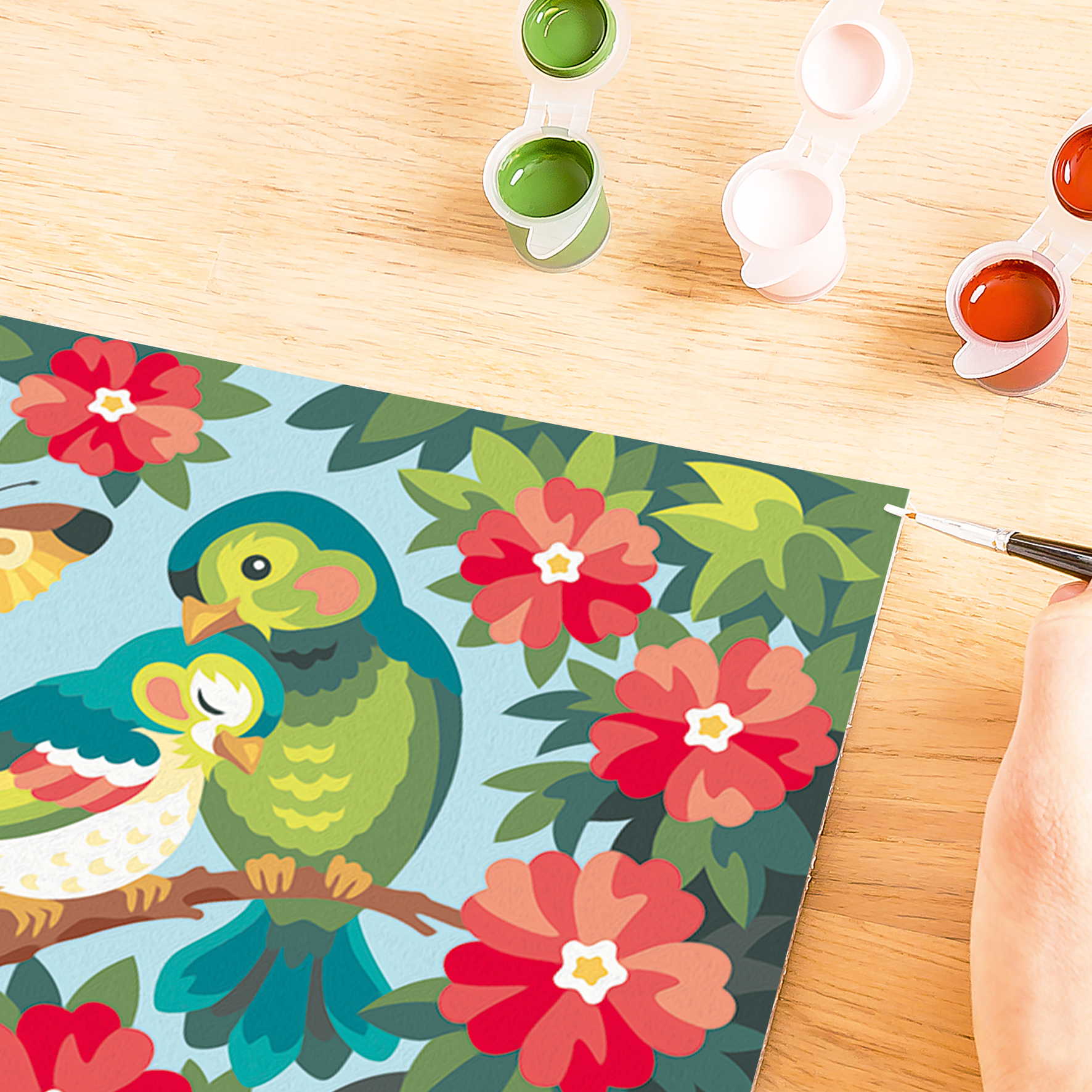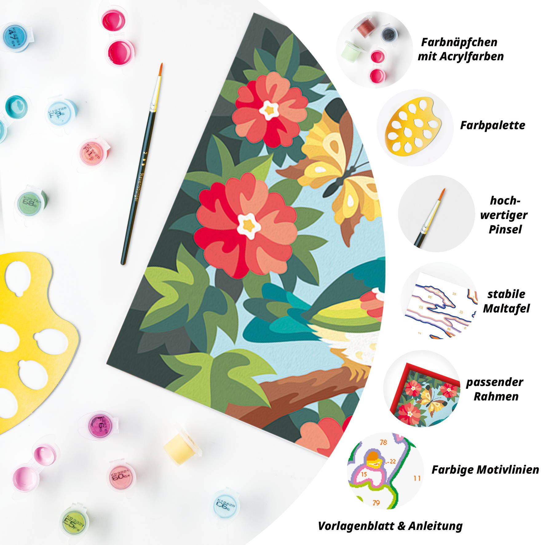 Das Malset enthält 20 Acrylfarben in wiederverschließbaren, nummerierten Näpfchen, eine stabile Maltafel mit Rahmen im Format 32,00 cm x 21,50 cm und einen Pinsel. Die Farben trocknen schnell, sind auf Wasserbasis, geruchsneutral und benötigen keinen Pinselreiniger