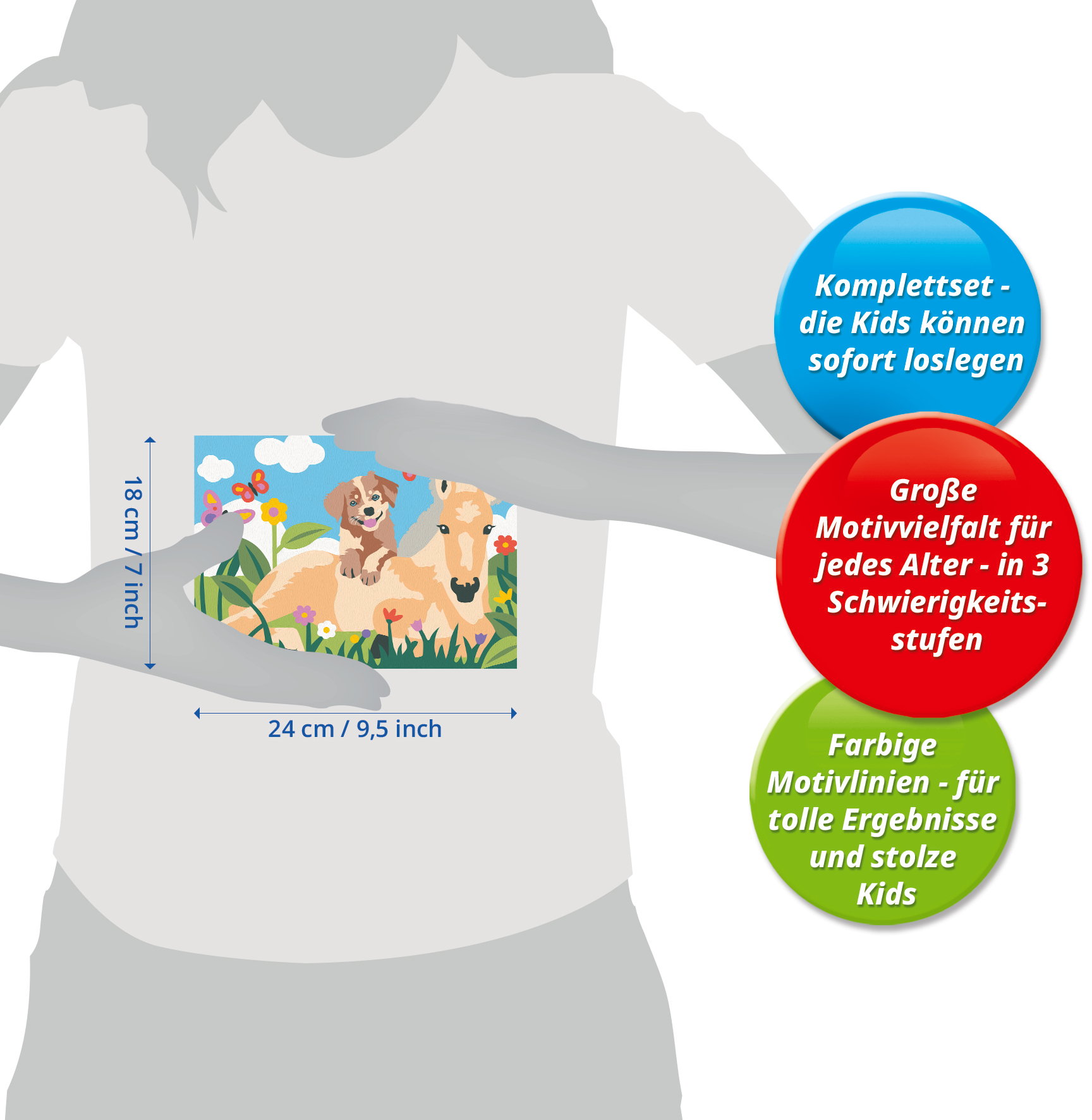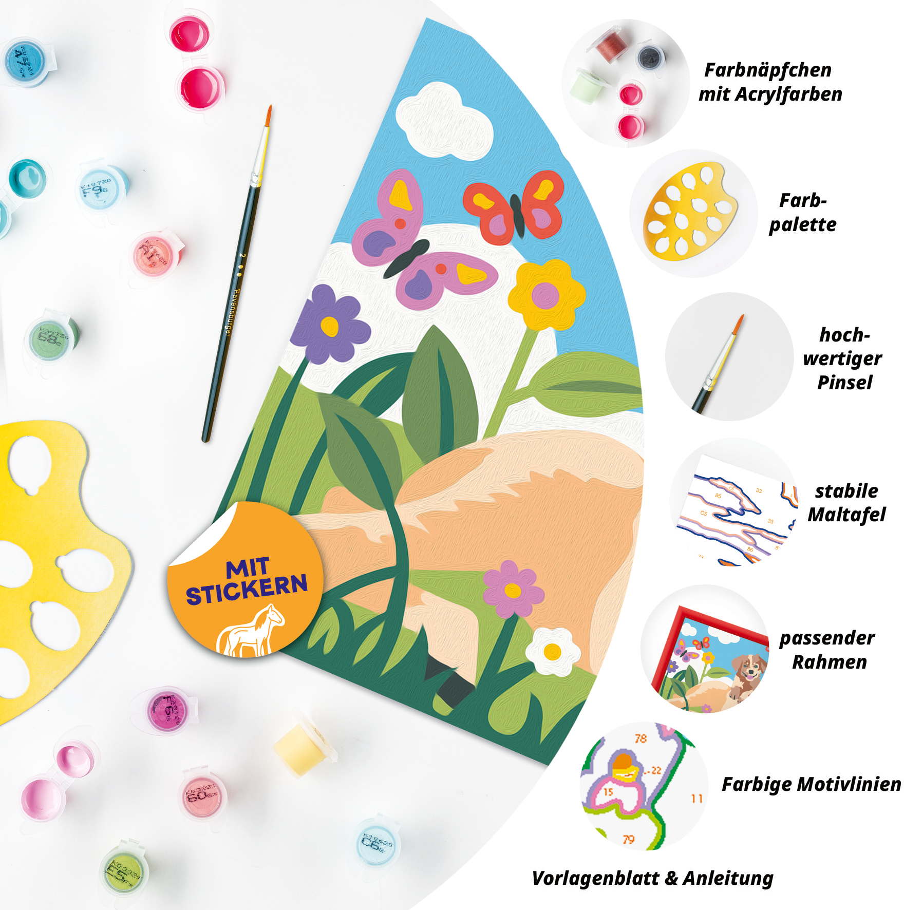 Das Malset enthält 15 Acrylfarben in wiederverschließbaren, nummerierten Näpfchen, eine stabile Maltafel mit Rahmen im Format 25 cm x 18,30 cm und einen Pinsel. Die Farben trocknen schnell, sind auf Wasserbasis, geruchsneutral und benötigen keinen Pinselreiniger