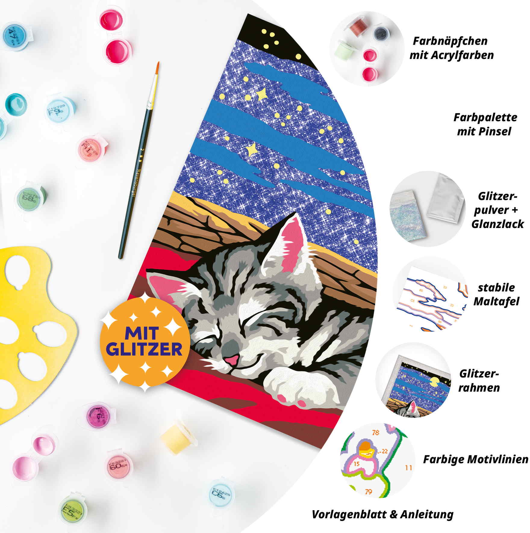 Das Malset enthält 15 Acrylfarben in wiederverschließbaren, nummerierten Näpfchen, eine stabile Maltafel mit Rahmen im Format 18,30 cm x 25,00 cm und einen Pinsel. Die Farben trocknen schnell, sind auf Wasserbasis, geruchsneutral und benötigen keinen Pinselreiniger