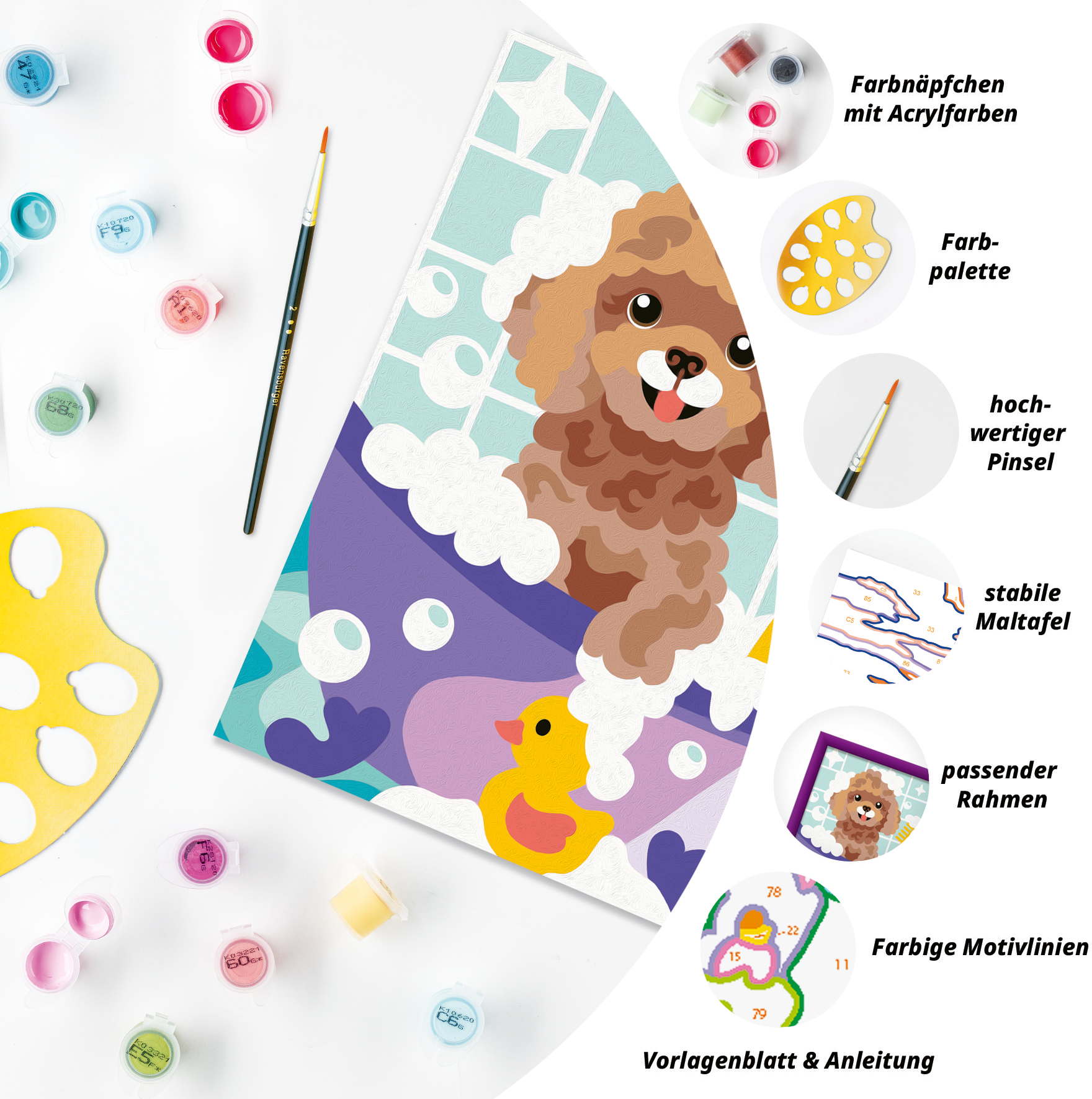 Das Malset enthält 15 Acrylfarben in wiederverschließbaren, nummerierten Näpfchen, eine stabile Maltafel mit Rahmen im Format 18,30 cm x 25 cm und einen Pinsel. Die Farben trocknen schnell, sind auf Wasserbasis, geruchsneutral und benötigen keinen Pinselreiniger