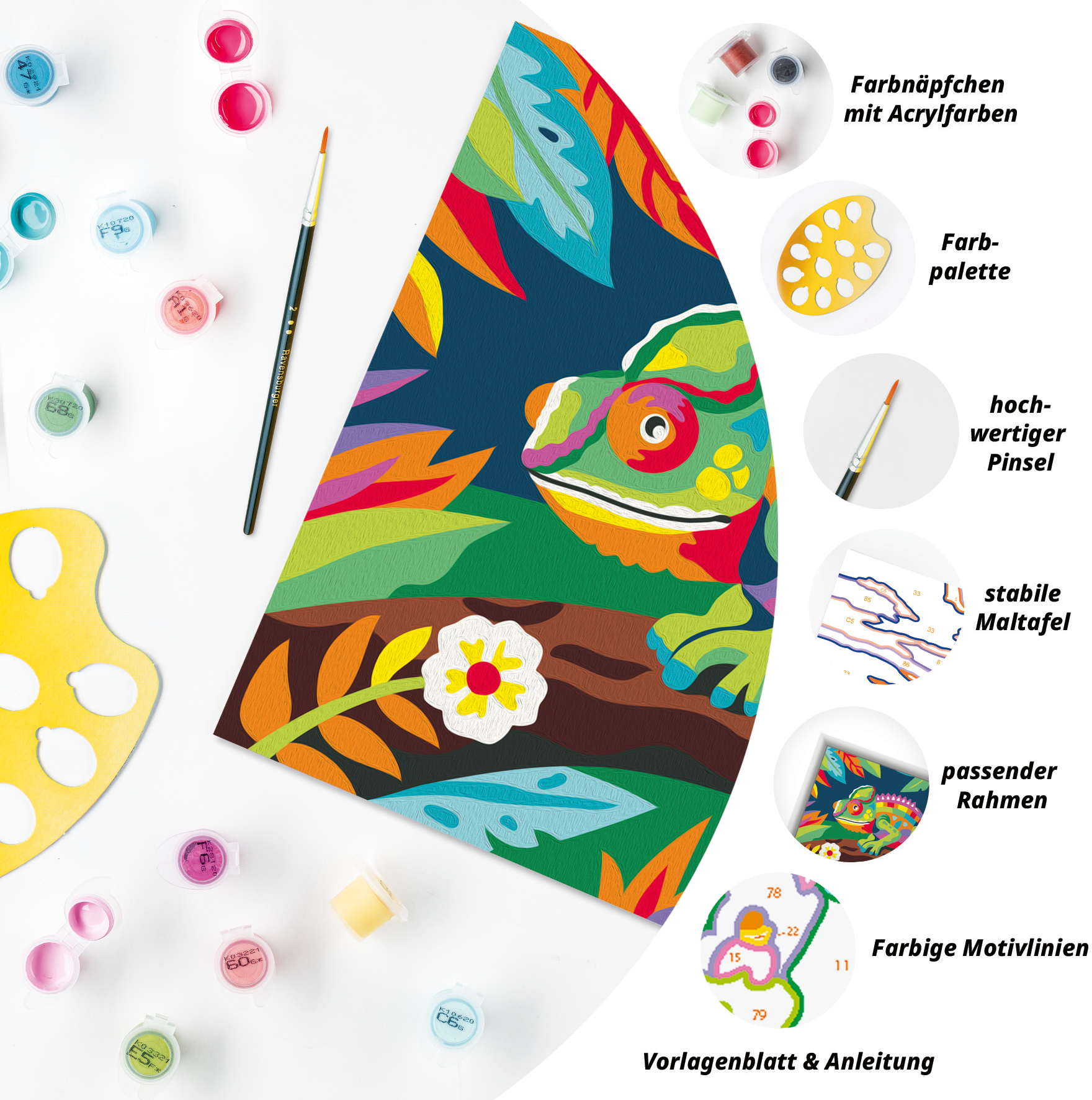 Das Malset enthält 15 Acrylfarben in wiederverschließbaren, nummerierten Näpfchen, eine stabile Maltafel mit Rahmen im Format 25 cm x 18,30 cm und einen Pinsel. Die Farben trocknen schnell, sind auf Wasserbasis, geruchsneutral und benötigen keinen Pinselreiniger