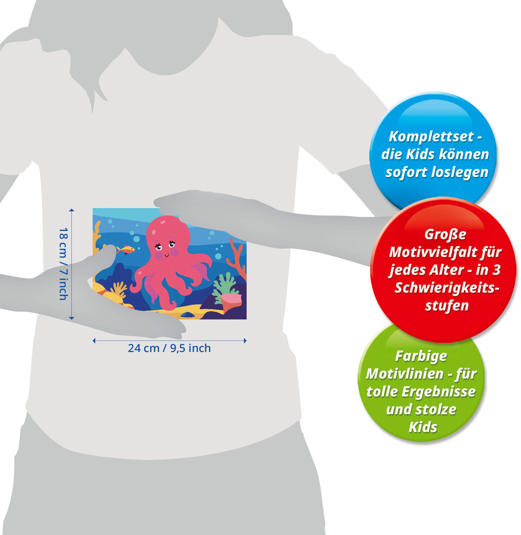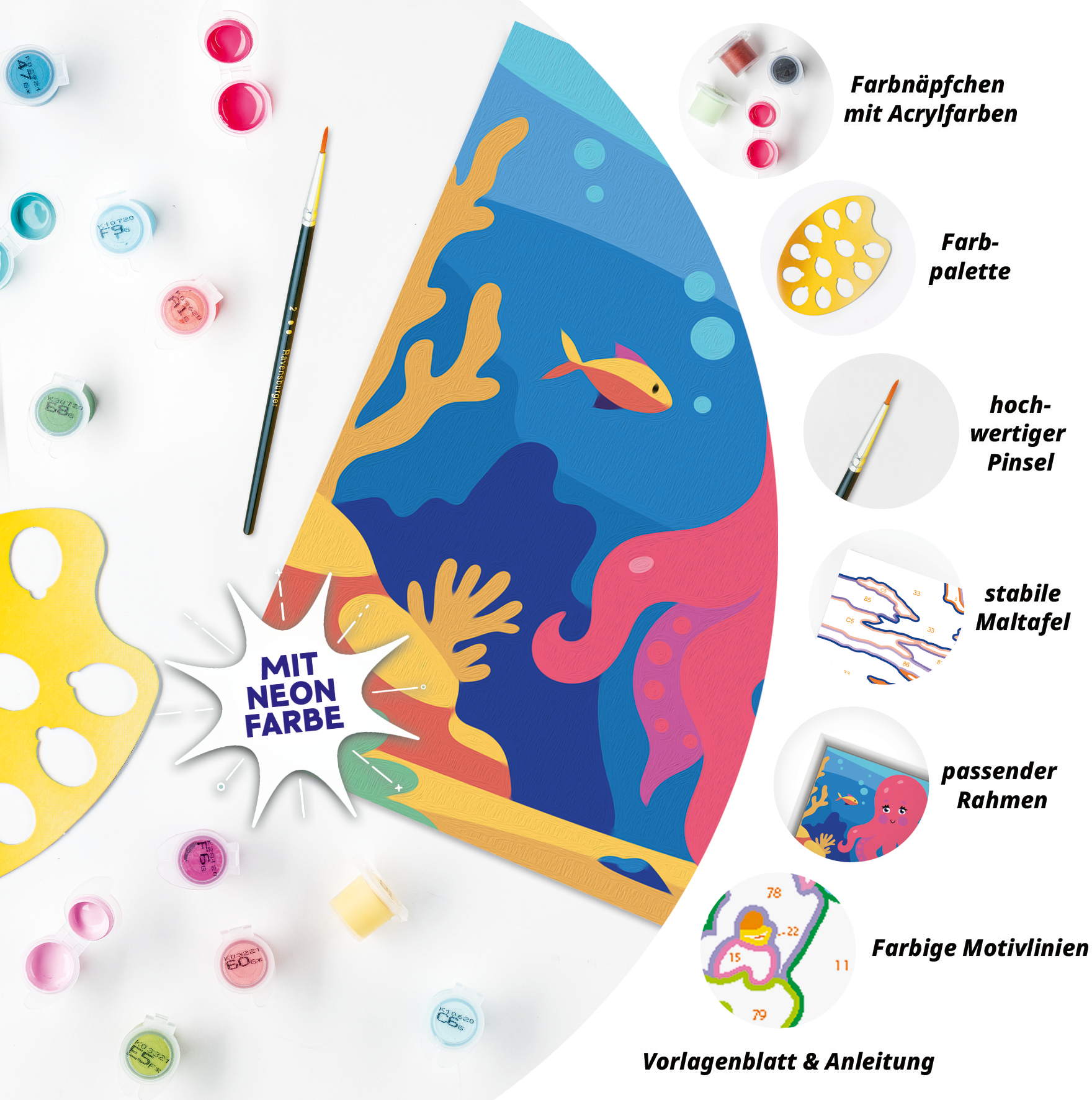 Das Malset enthält 13 Acrylfarben in wiederverschließbaren, nummerierten Näpfchen, eine stabile Maltafel mit Rahmen im Format 25 cm x 18,30 cm und einen Pinsel. Die Farben trocknen schnell, sind auf Wasserbasis, geruchsneutral und benötigen keinen Pinselreiniger