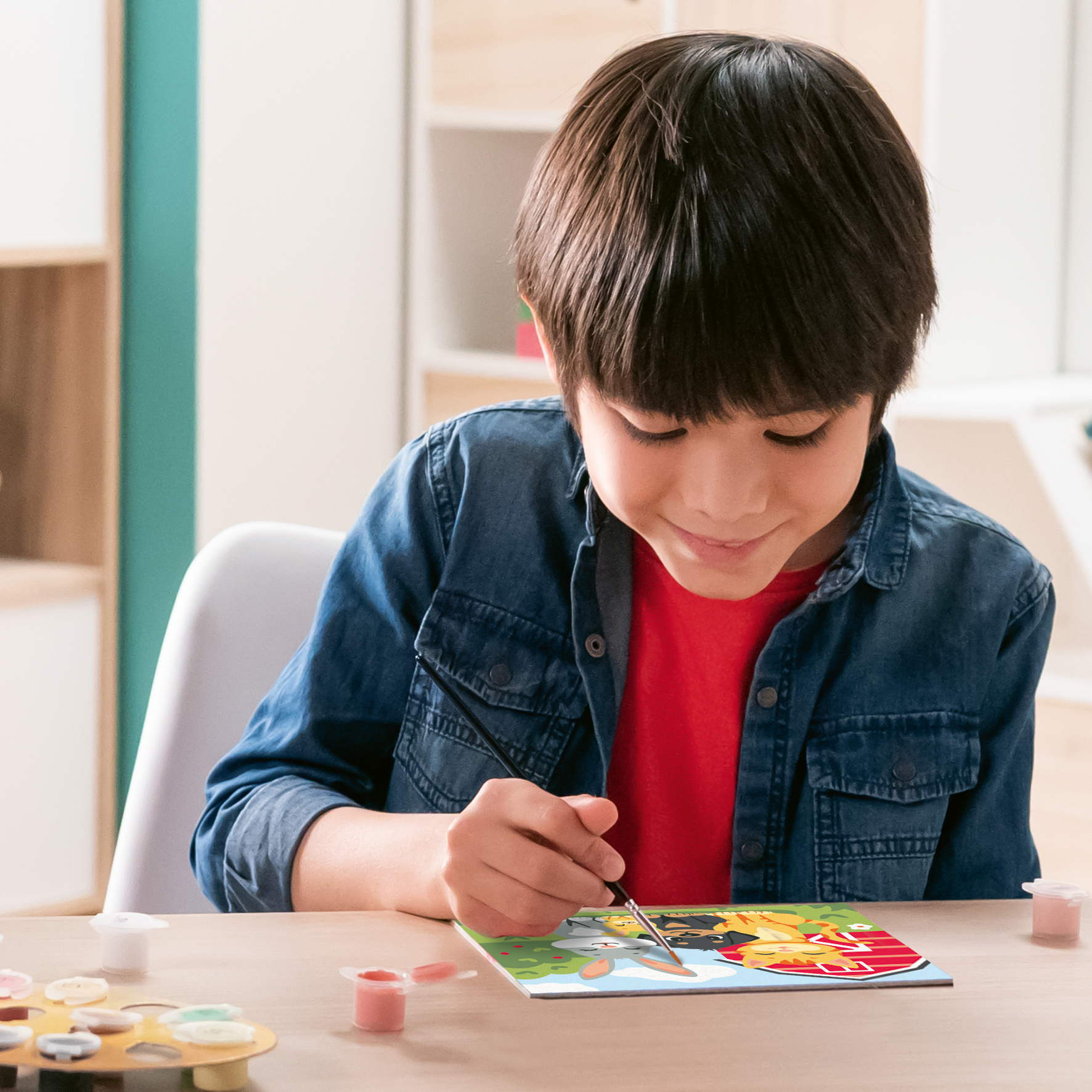 Das Malset enthält 14 Acrylfarben in wiederverschließbaren, nummerierten Näpfchen, eine stabile Maltafel mit Rahmen im Format 25 cm x 18,30 cm und einen Pinsel. Die Farben trocknen schnell, sind auf Wasserbasis, geruchsneutral und benötigen keinen Pinselreiniger
