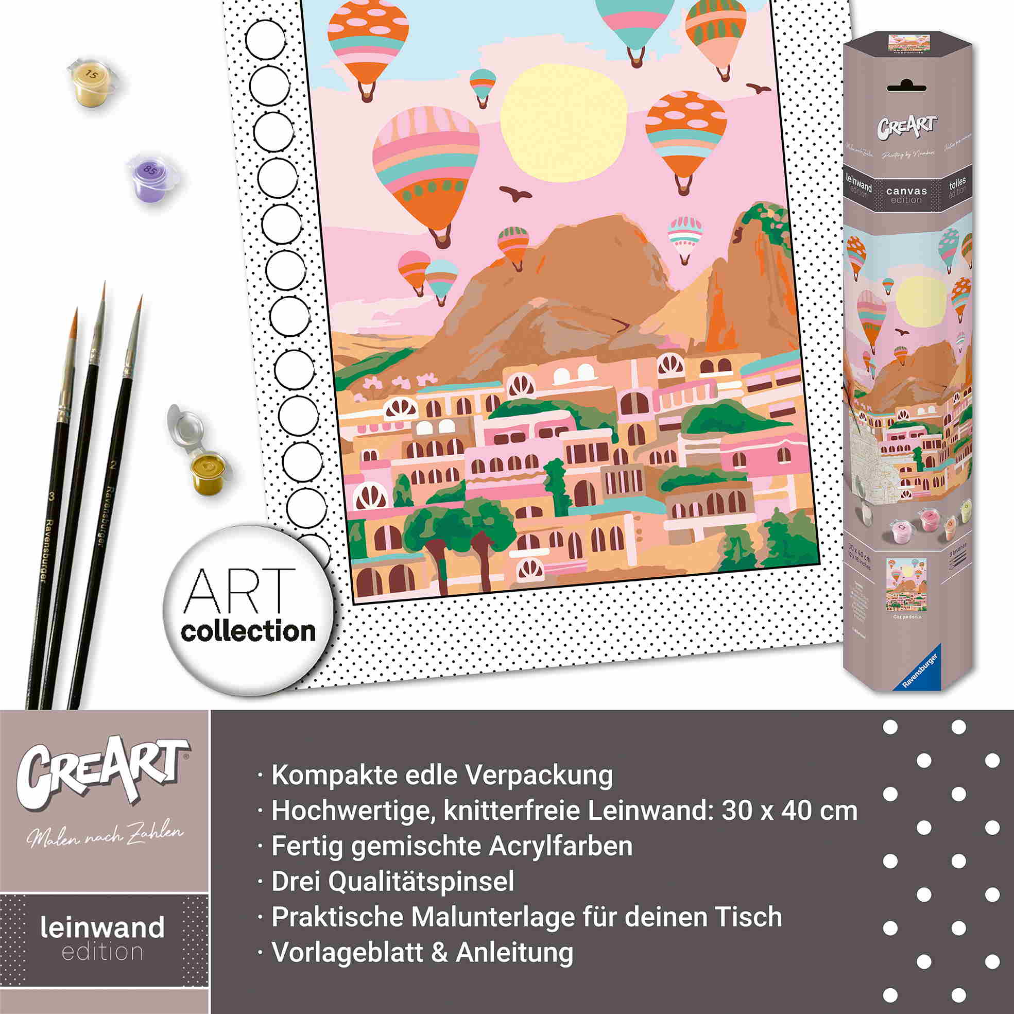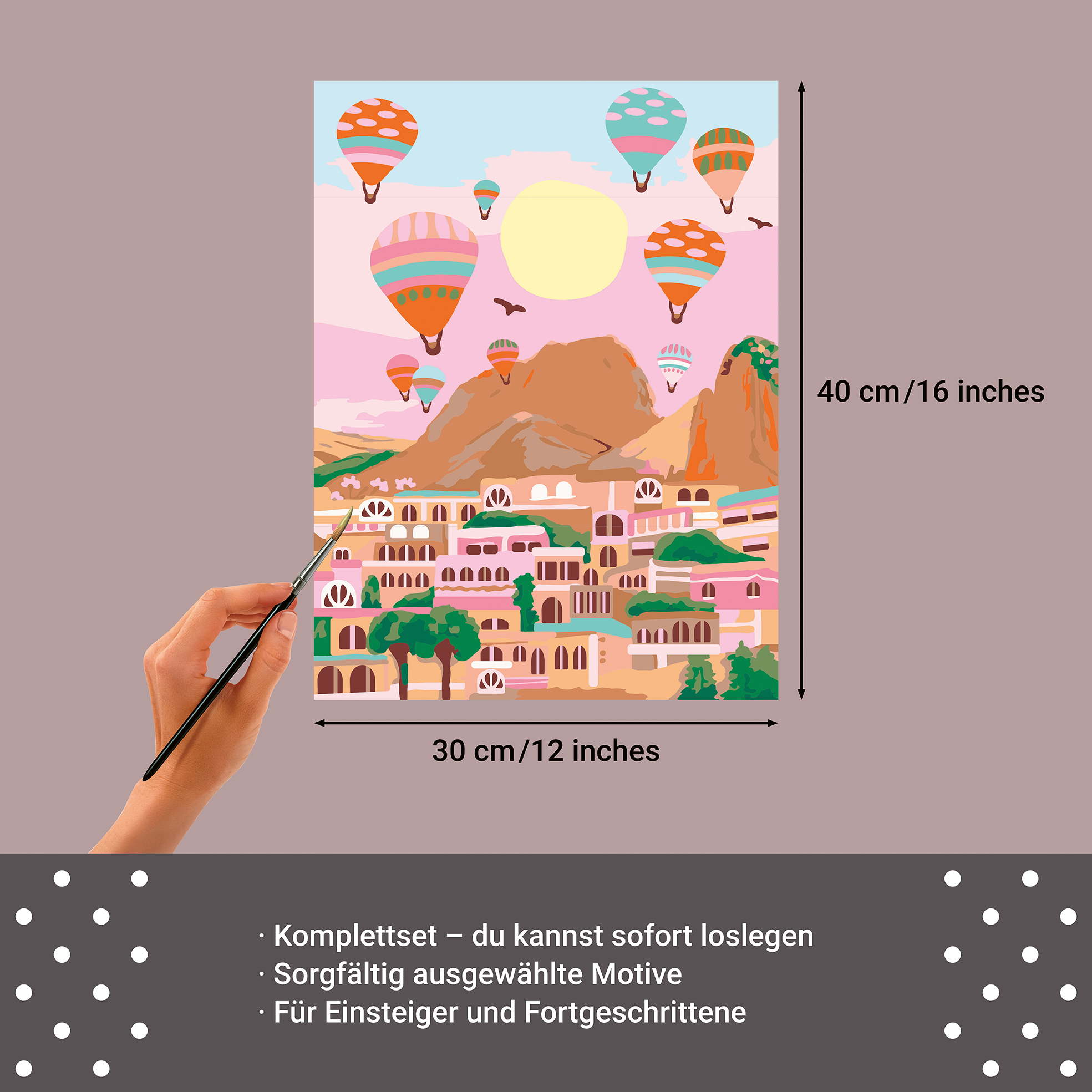 Malset enthält: Acrylfarben in wiederverschließbaren, nummerierten Töpfen, Leinwand mit den Maßen 30,00 cm x 40,00 cm, Malunterlage, Pinselset, Vorlageblatt – Farben trocknen schnell, sind wasserbasiert, geruchsneutral und benötigen keinen Pinselreiniger