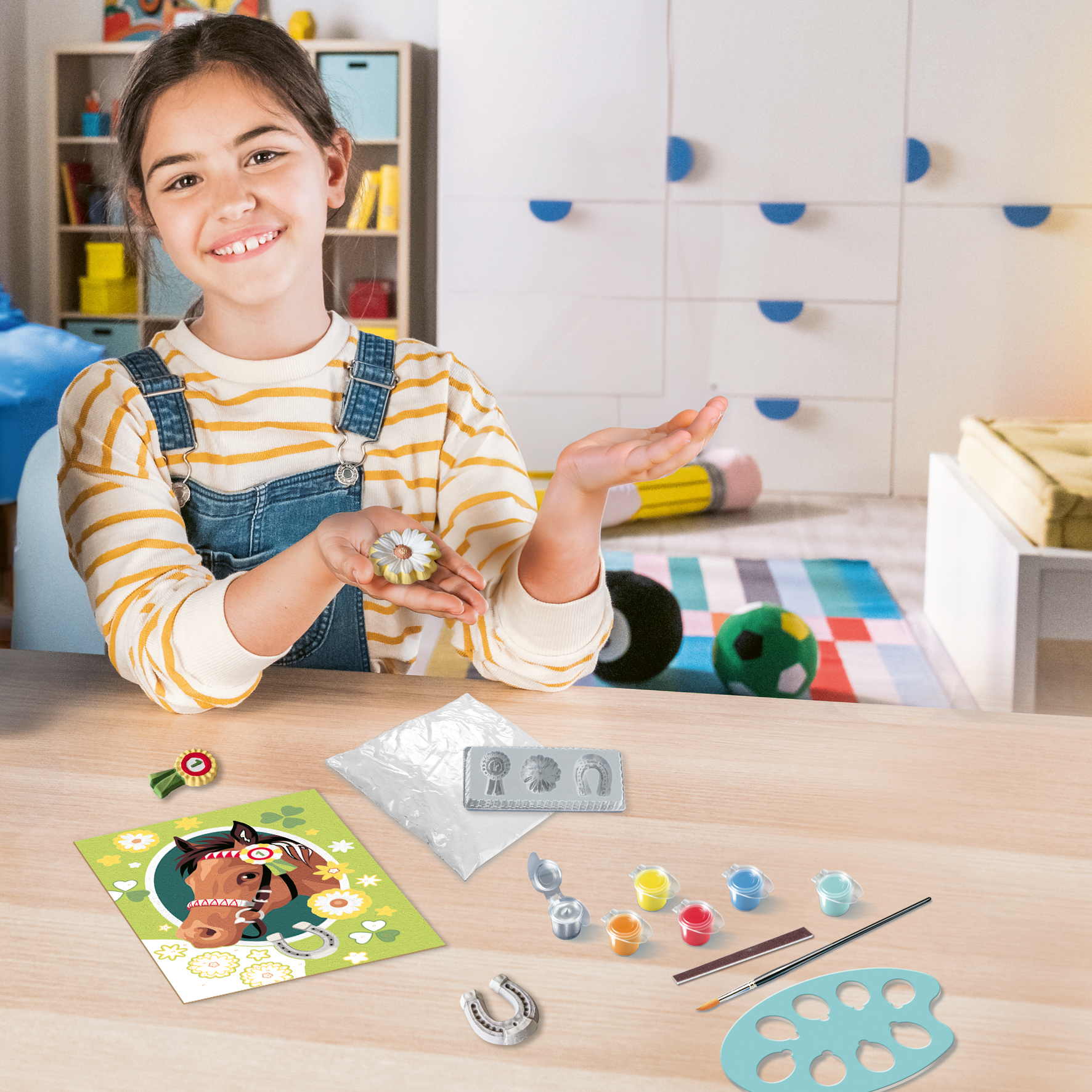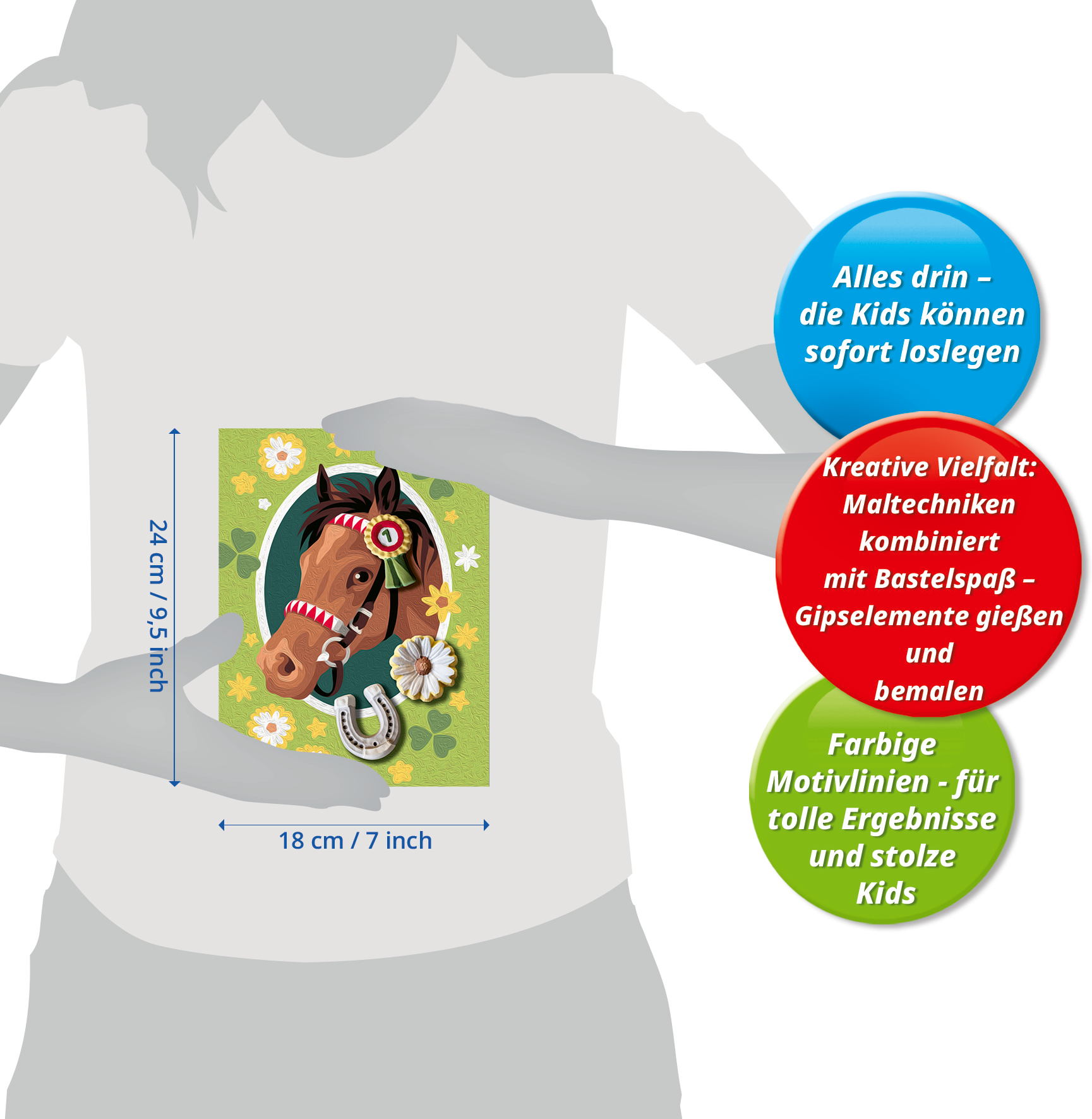 Das Motiv Pferdeglück, zusammen mit den dekorativen Gipselementen Hufeisen, Blume, und Turnierschleife, ist ein wunderbares Geschenk für alle kreativen Köpfe und Bastelbegeisterten.