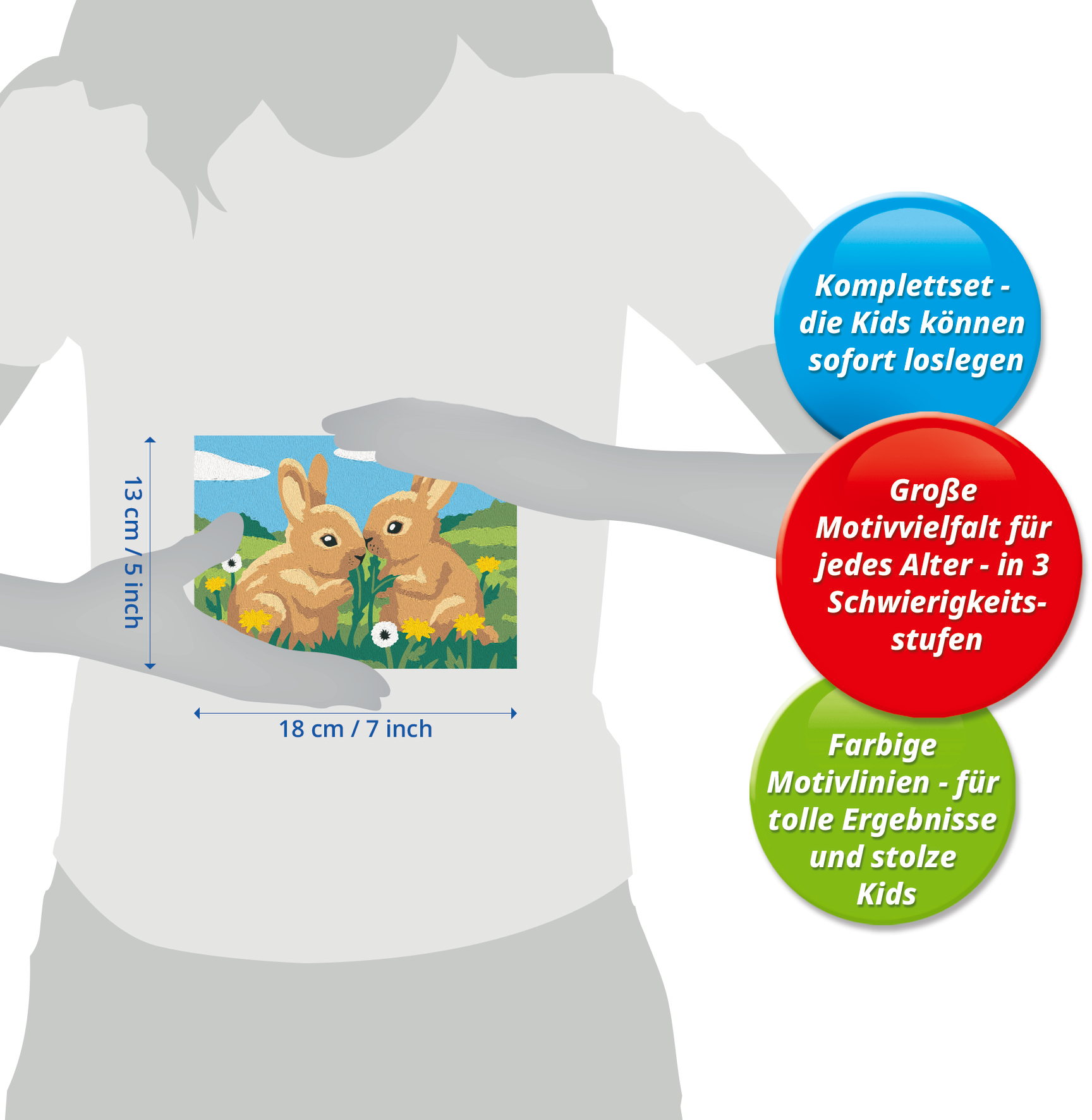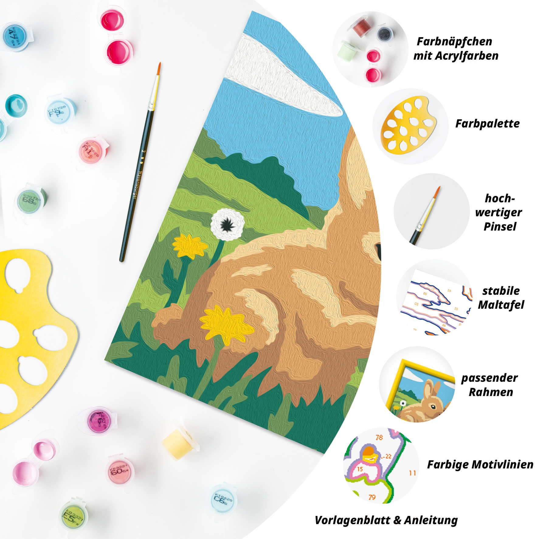 Das Malset enthält 10 Acrylfarben in wiederverschließbaren, nummerierten Näpfchen, eine stabile Maltafel mit Rahmen im Format 19 cm x 14 cm und einen Pinsel. Die Farben trocknen schnell, sind auf Wasserbasis, geruchsneutral und benötigen keinen Pinselreiniger