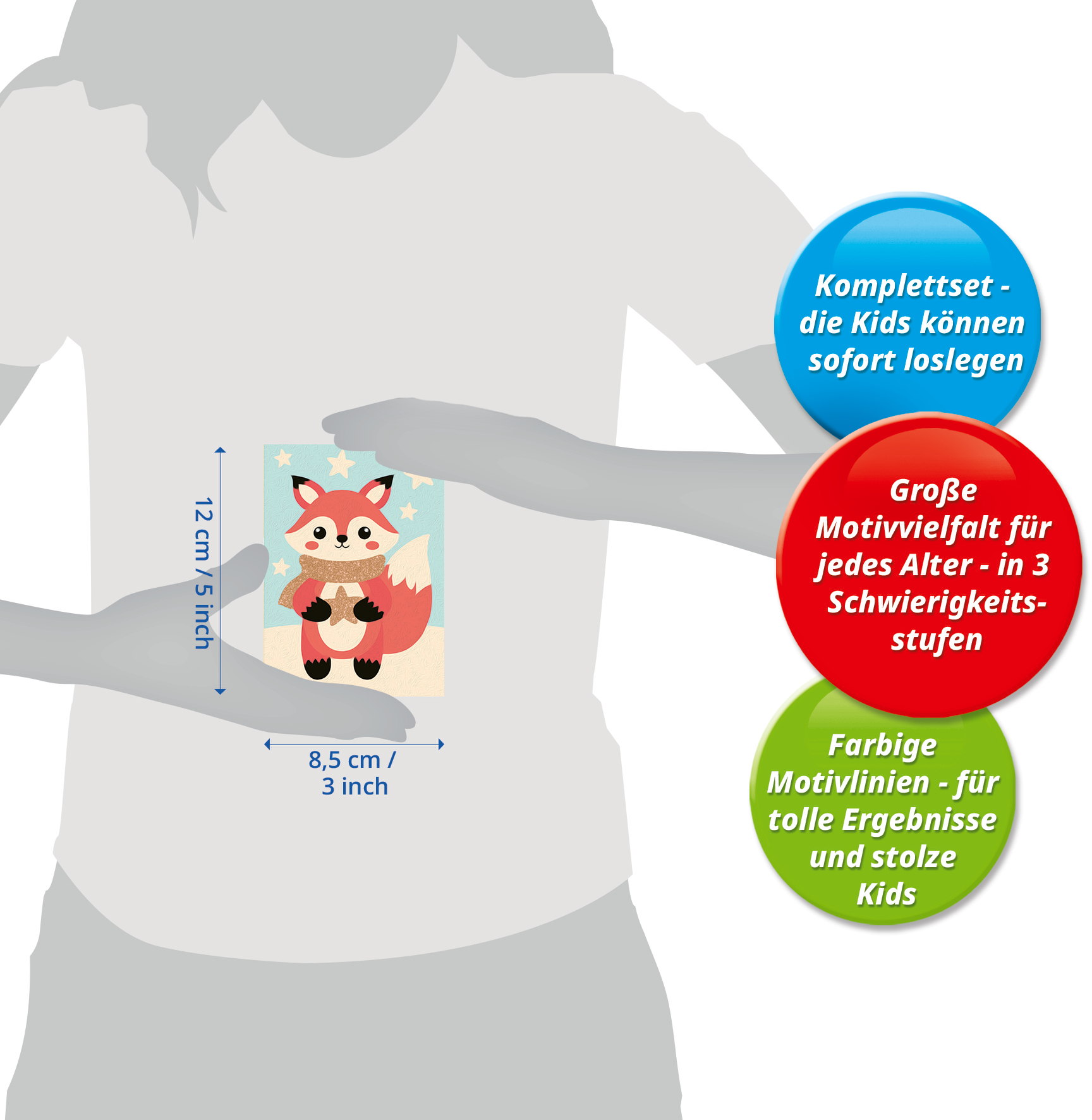 Das Malset enthält 6 Acrylfarben in wiederverschließbaren, nummerierten Näpfchen, eine stabile Maltafel mit Rahmen im Format 9,5 cm x 13,20 cm und einen Pinsel. Die Farben trocknen schnell, sind auf Wasserbasis, geruchsneutral und benötigen keinen Pinselreiniger