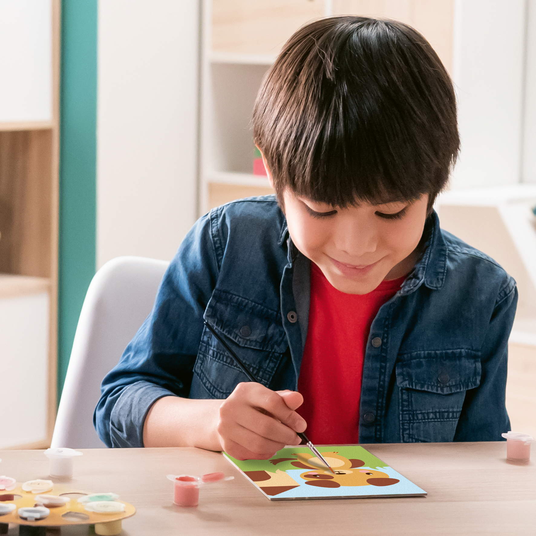 Das Malset enthält 6 Acrylfarben in wiederverschließbaren, nummerierten Näpfchen, eine stabile Maltafel mit Rahmen im Format 9,5 cm x 13,20 cm und einen Pinsel. Die Farben trocknen schnell, sind auf Wasserbasis, geruchsneutral und benötigen keinen Pinselreiniger