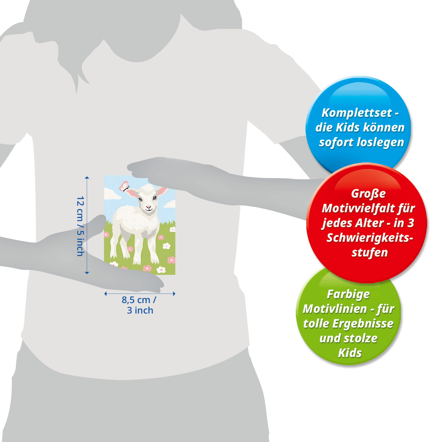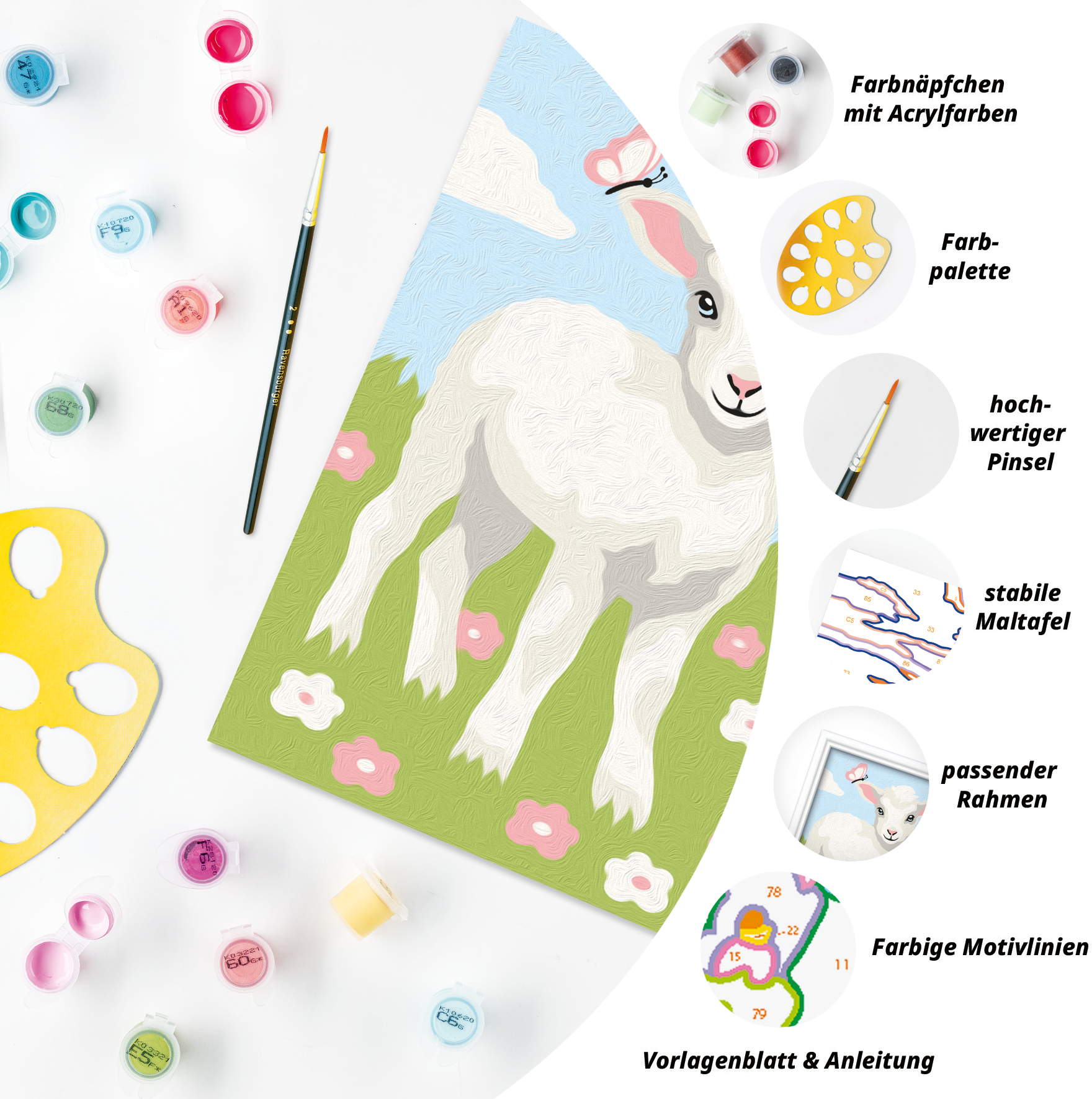 Das Malset enthält 6 Acrylfarben in wiederverschließbaren, nummerierten Näpfchen, eine stabile Maltafel mit Rahmen im Format 9,5 cm x 13,20 cm und einen Pinsel. Die Farben trocknen schnell, sind auf Wasserbasis, geruchsneutral und benötigen keinen Pinselreiniger