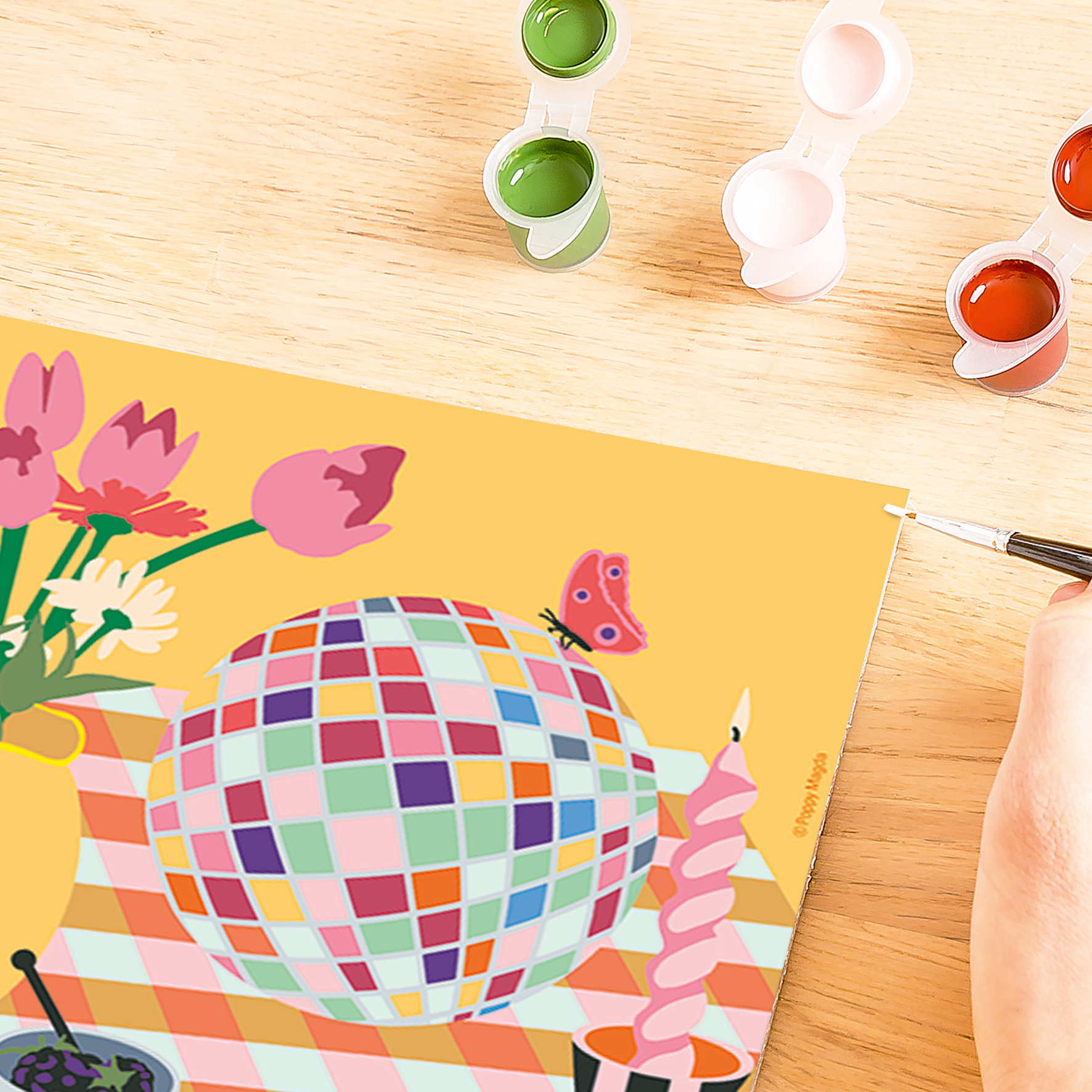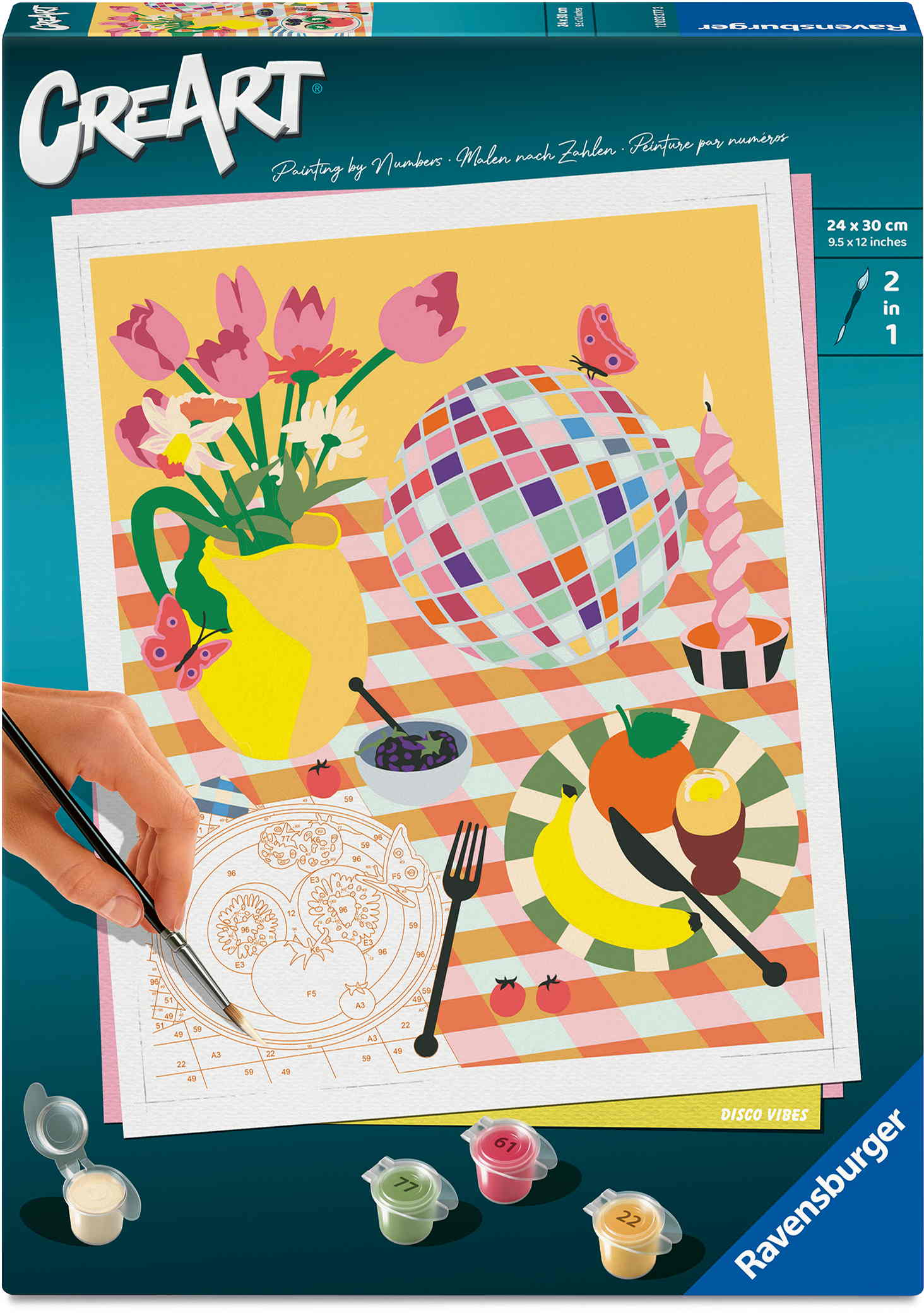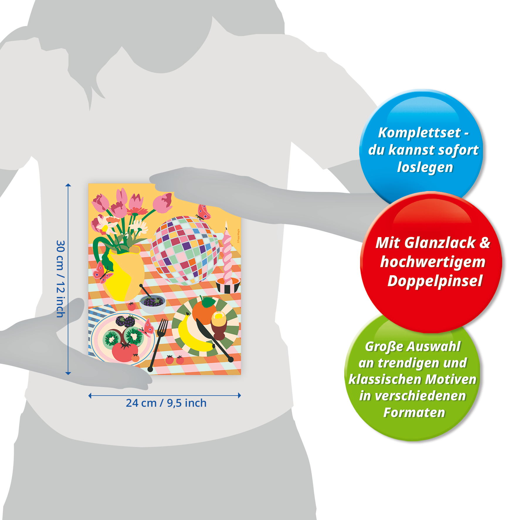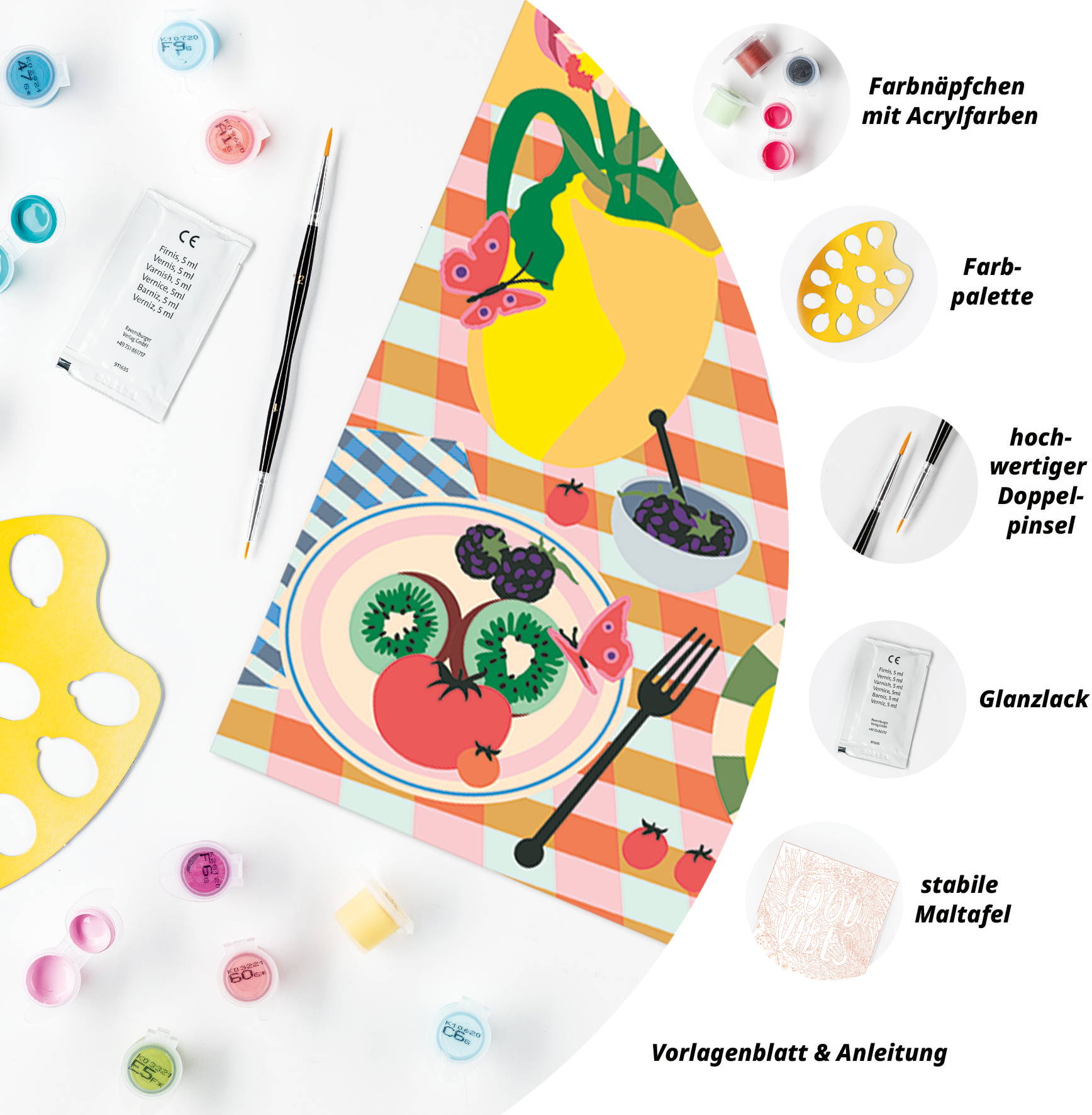 1 Maltafel, 20 Acrylfarben auf Wasserbasis in wiederverschließbaren Näpfchen, 1 Qualitätspinsel, Farbpalette, Bildaufhänger, Glanzlack und Anleitung.