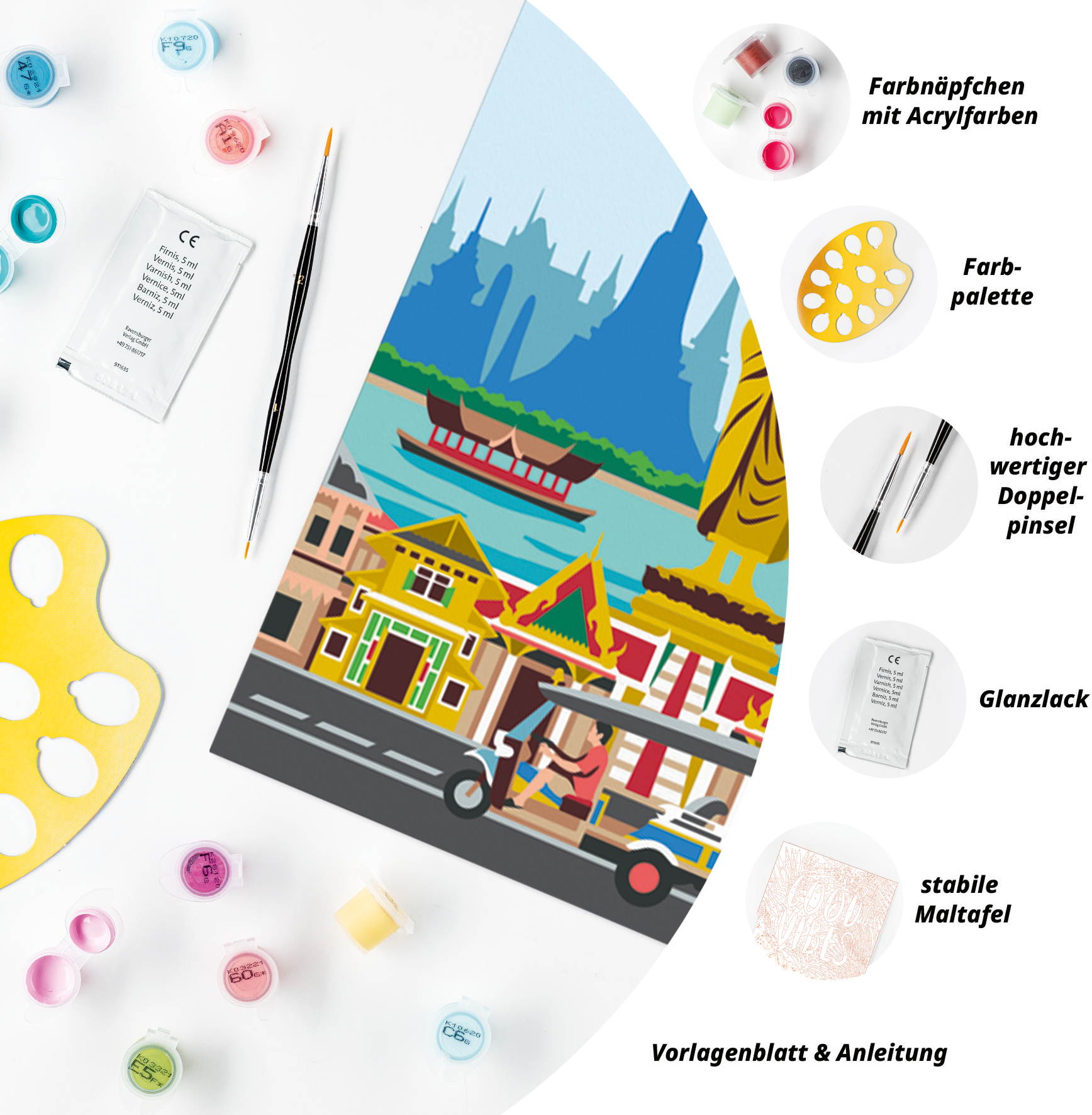 1 Maltafel, 20 Acrylfarben auf Wasserbasis in wiederverschließbaren Näpfchen, 1 Qualitätspinsel, Farbpalette, Bildaufhänger, Glanzlack und Anleitung.