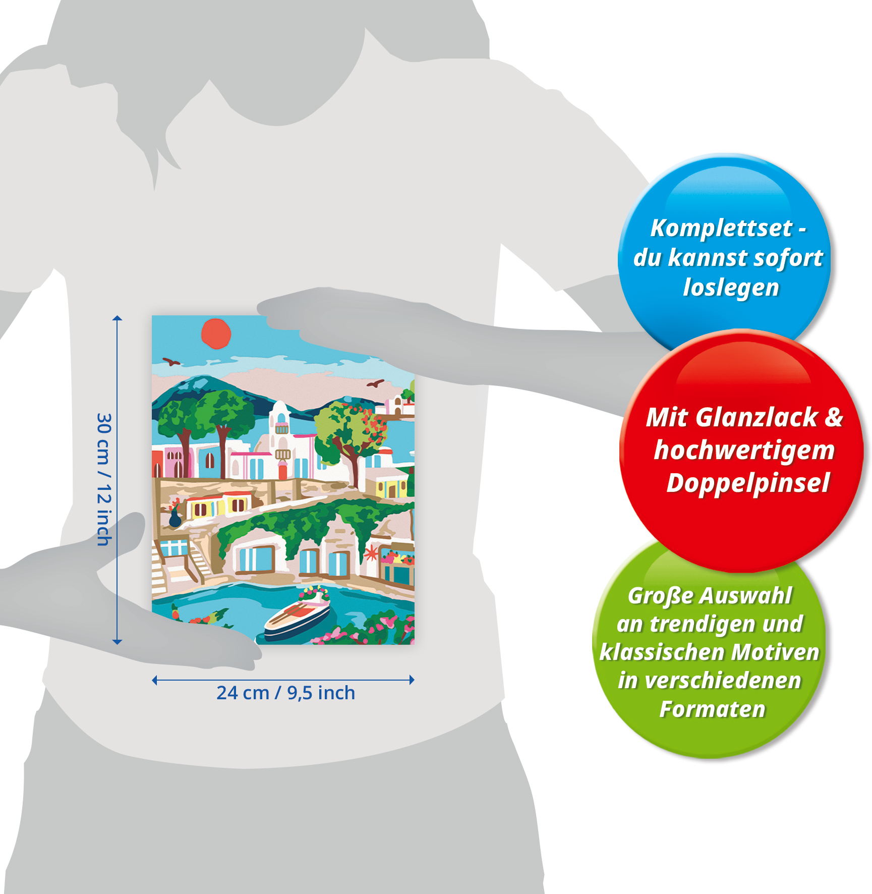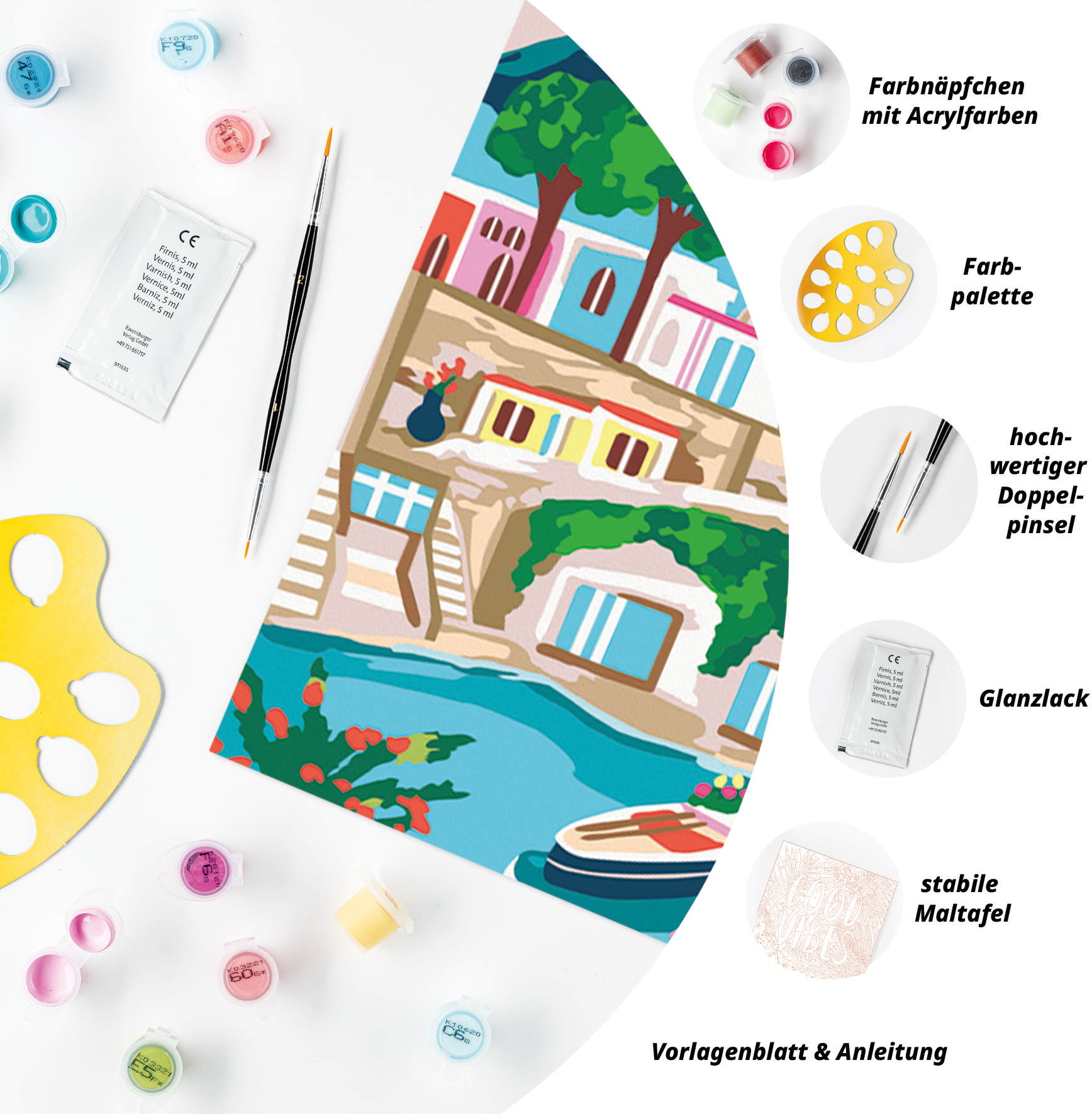 1 Maltafel, 20 Acrylfarben auf Wasserbasis in wiederverschließbaren Näpfchen, 1 Qualitätspinsel, Farbpalette, Bildaufhänger, Glanzlack und Anleitung.
