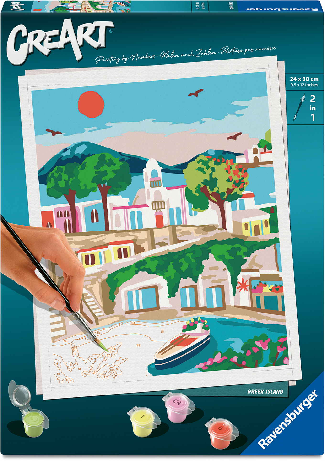 Das Malset enthält: Acrylfarben in wiederverschließbaren, nummerierten Töpfen, eine Maltafel mit den Maßen 24,00 cm x 30,00 cm, einen Pinsel, eine Anleitung – die Farben trocknen schnell, sind wasserbasiert, geruchsneutral und erfordern keinen Pinselreiniger
