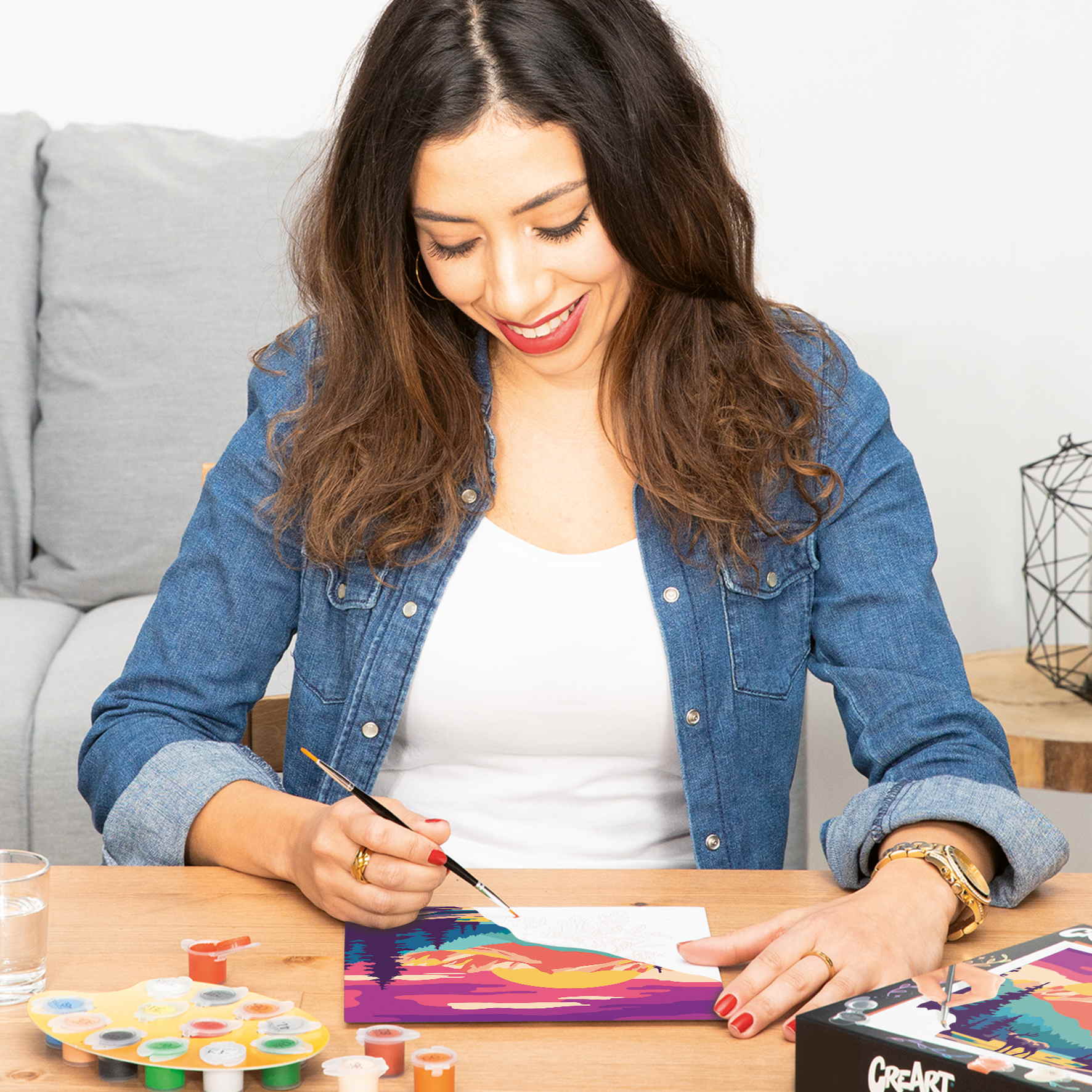 1 Maltafel, 17 Acrylfarben auf Wasserbasis in wiederverschließbaren Näpfchen, 1 Qualitätspinsel, Farbpalette, Bildaufhänger, Glanzlack und Anleitung.
