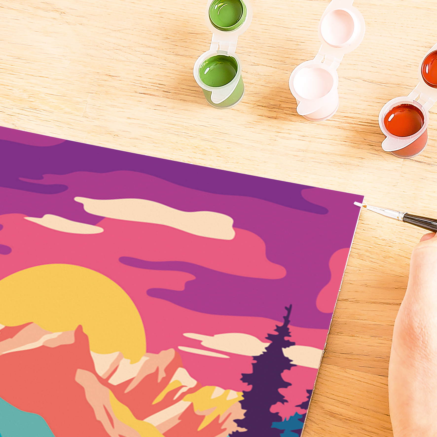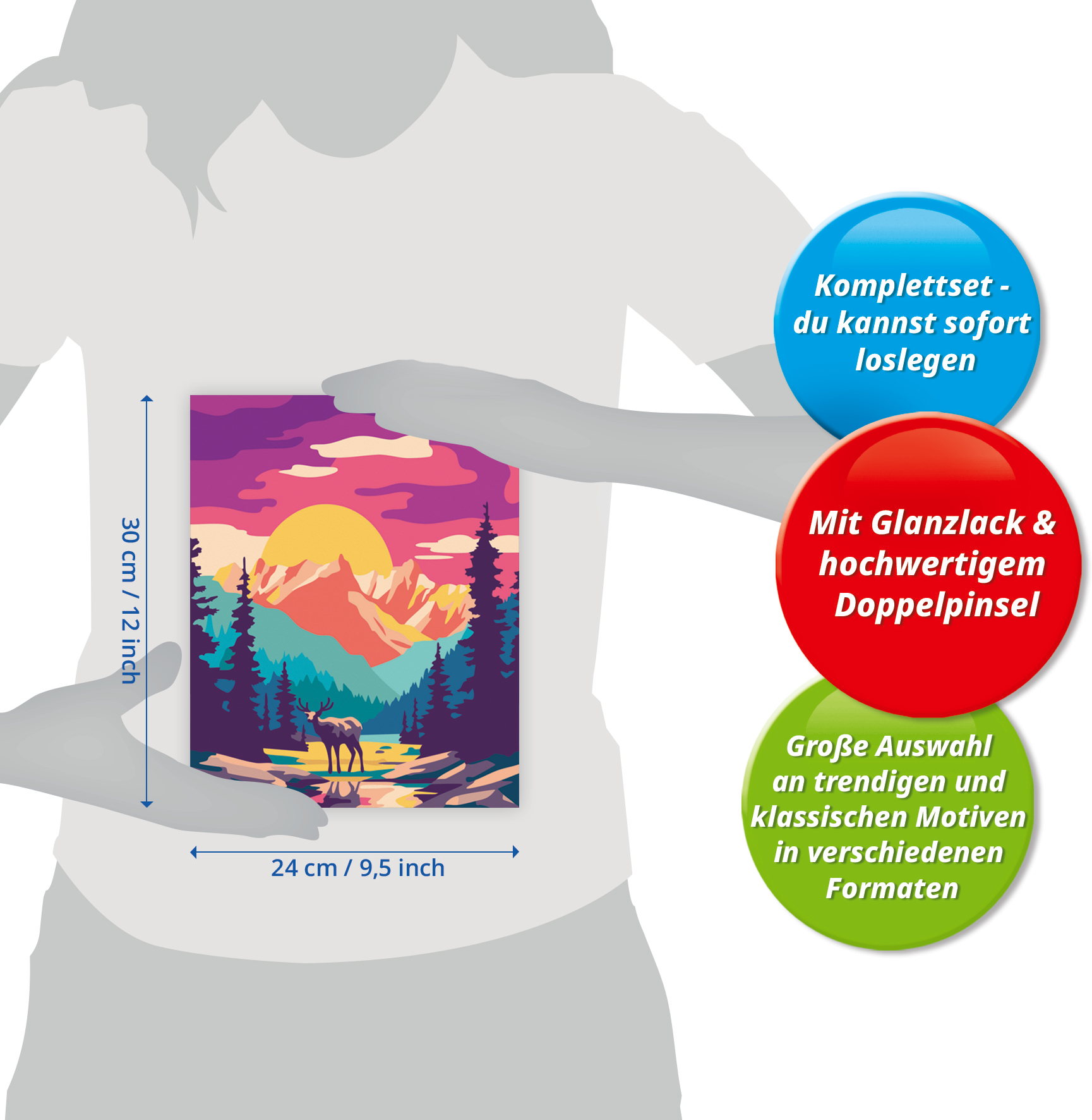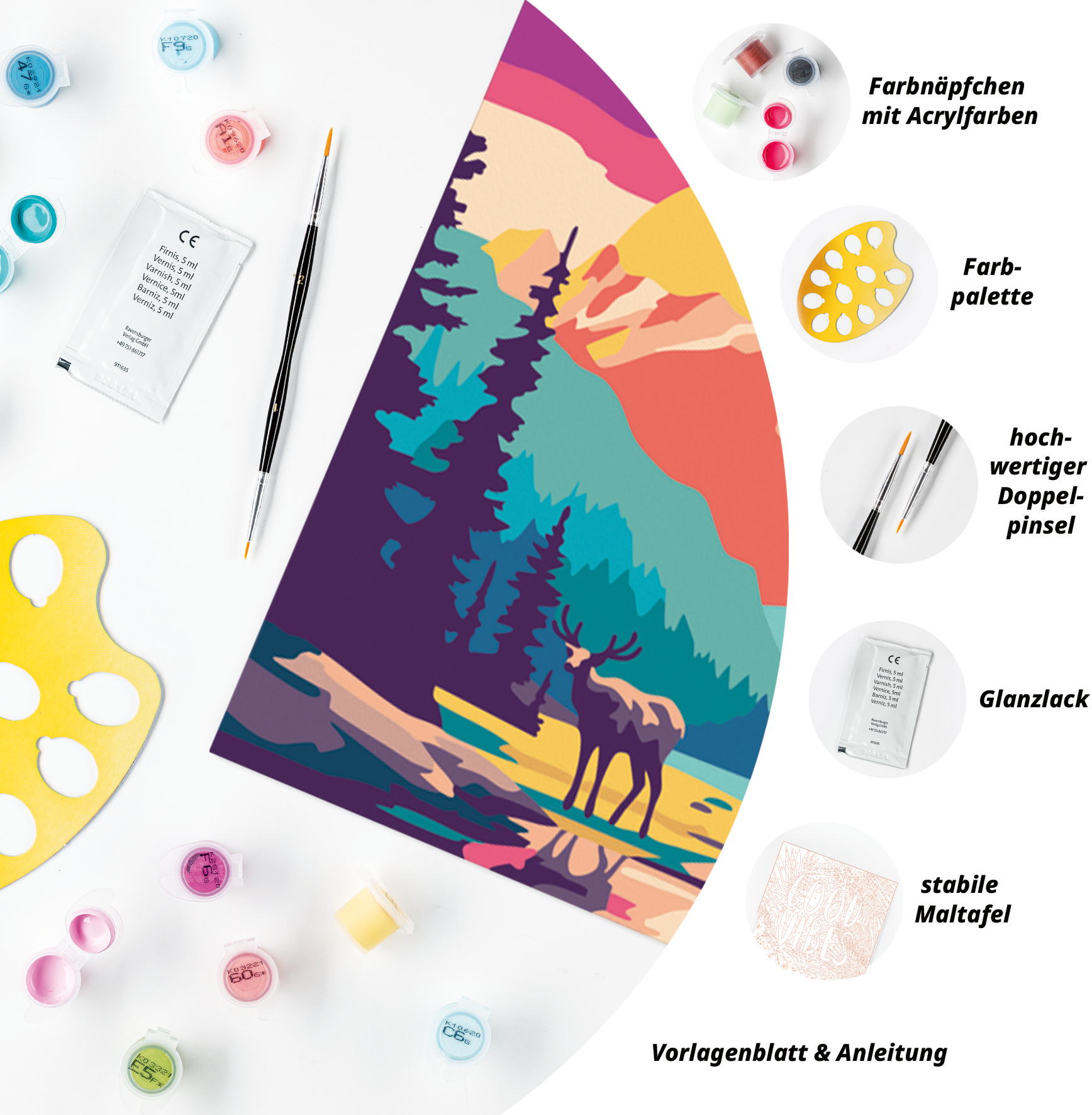 Das Malset enthält: Acrylfarben in wiederverschließbaren, nummerierten Töpfen, eine Maltafel mit den Maßen 24,00 cm x 30,00 cm, einen Pinsel, eine Anleitung – die Farben trocknen schnell, sind wasserbasiert, geruchsneutral und erfordern keinen Pinselreiniger
