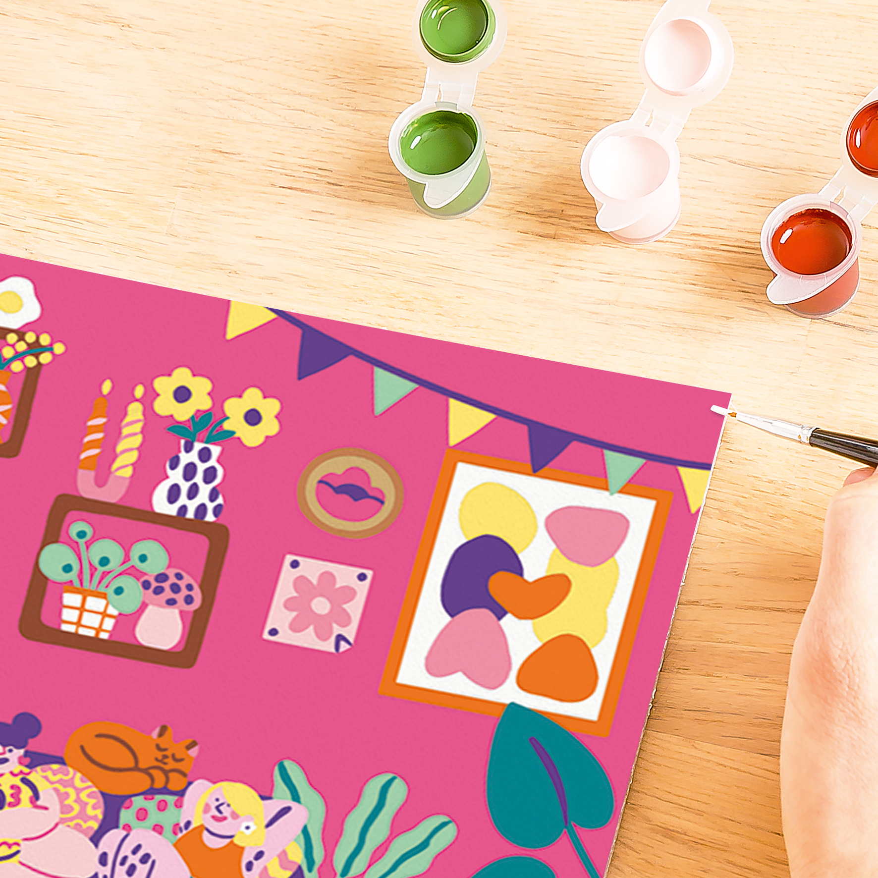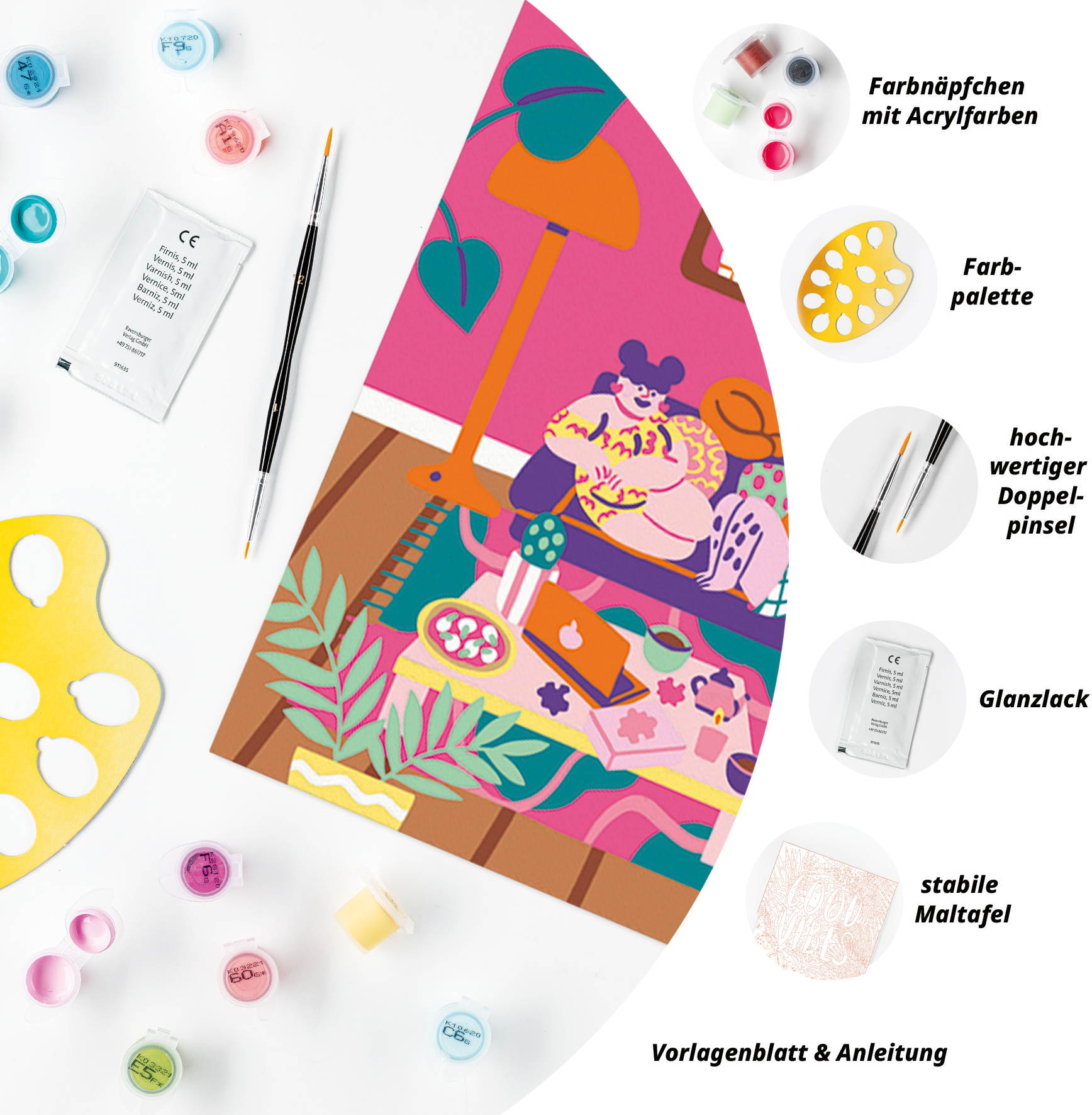 Das Malset enthält: Acrylfarben in wiederverschließbaren, nummerierten Töpfen, eine Maltafel mit den Maßen 24,00 cm x 30,00 cm, einen Pinsel, eine Anleitung – die Farben trocknen schnell, sind wasserbasiert, geruchsneutral und erfordern keinen Pinselreiniger