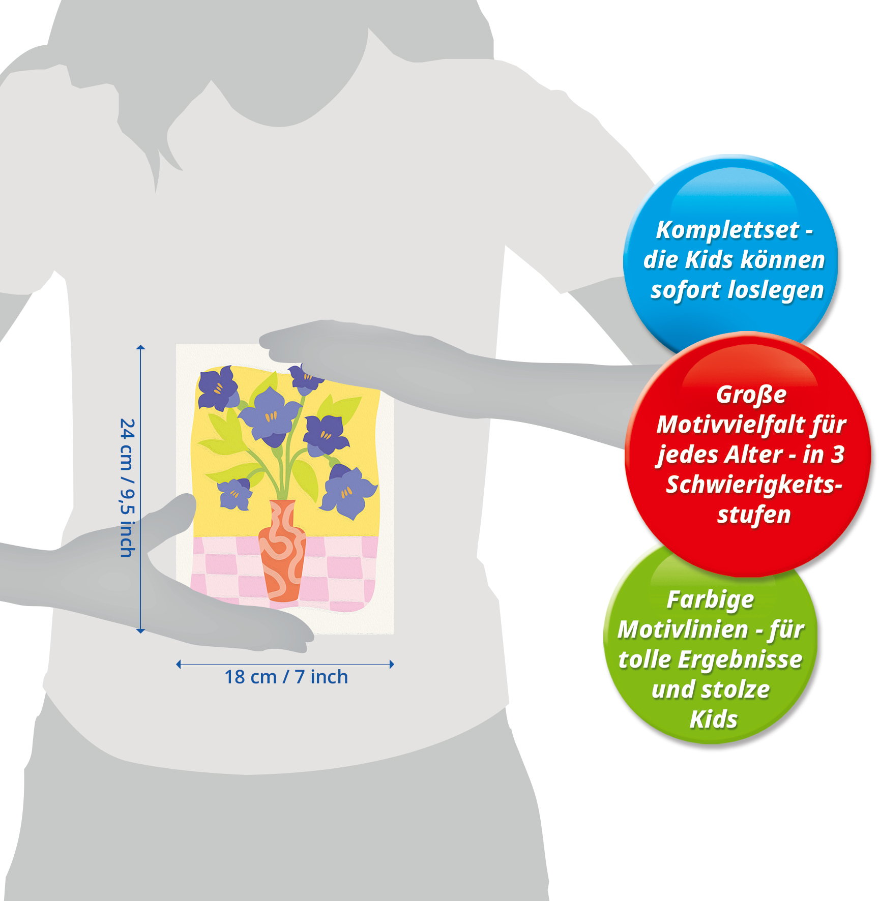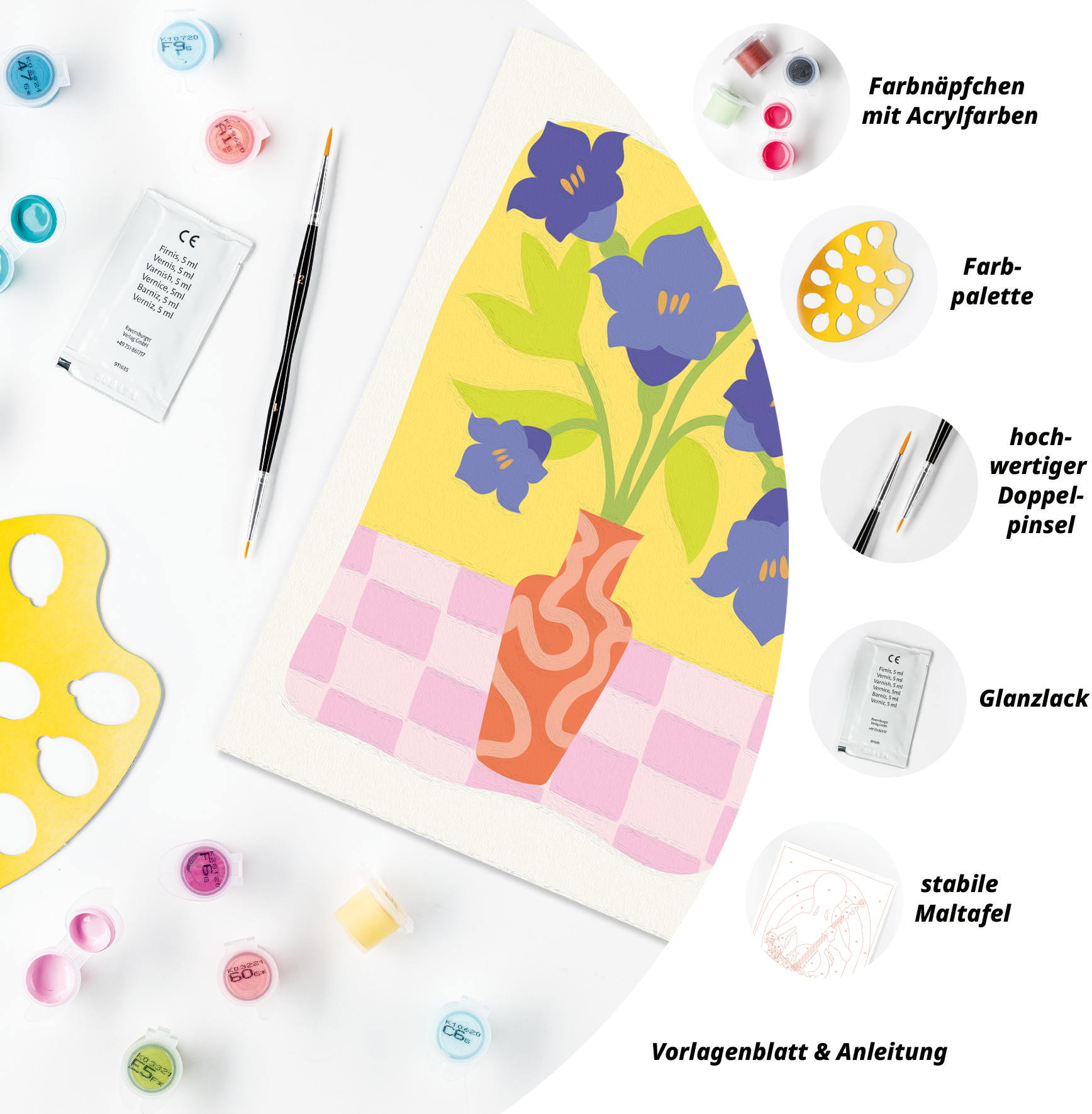 Das Malset enthält: Acrylfarben in wiederverschließbaren, nummerierten Töpfen, eine Maltafel mit den Maßen 18 cm x 24 cm, einen Pinsel, eine Anleitung – die Farben trocknen schnell, sind wasserbasiert, geruchsneutral und erfordern keinen Pinselreiniger