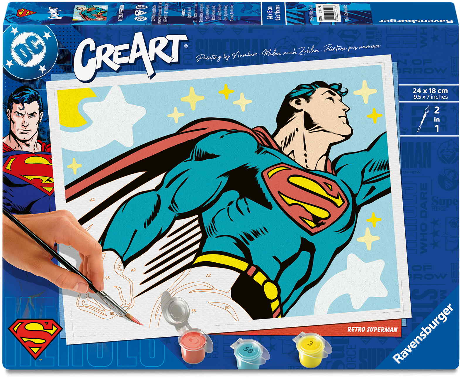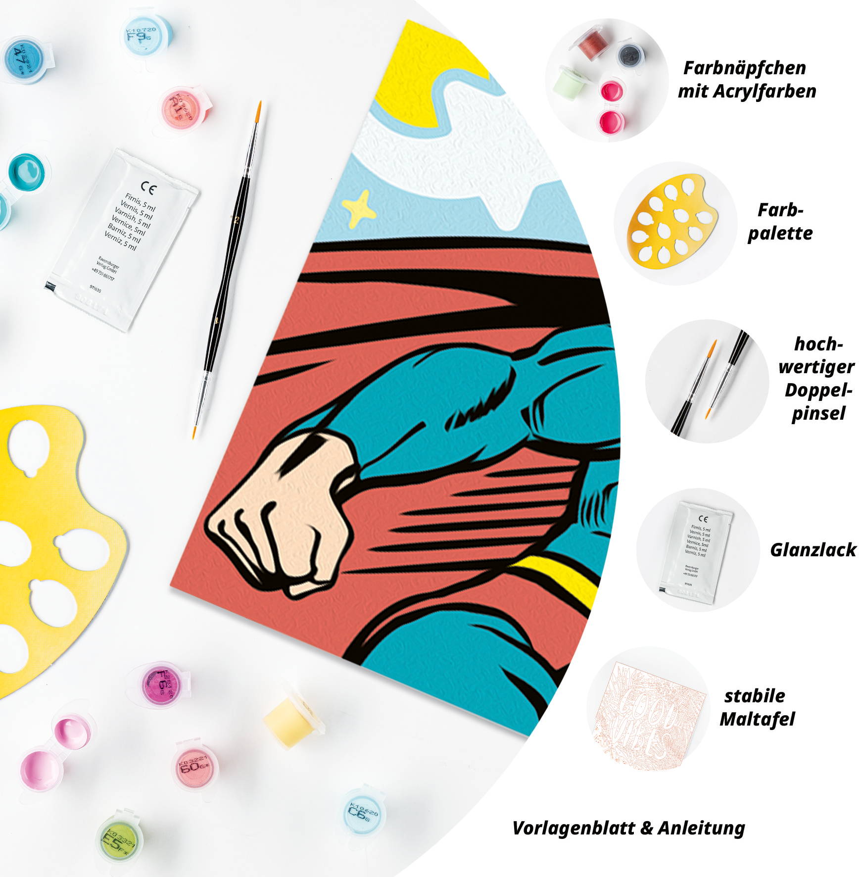 Das Malset enthält: Acrylfarben in wiederverschließbaren, nummerierten Töpfen, eine Maltafel mit den Maßen 24 cm x 18 cm, einen Pinsel, eine Anleitung – die Farben trocknen schnell, sind wasserbasiert, geruchsneutral und erfordern keinen Pinselreiniger